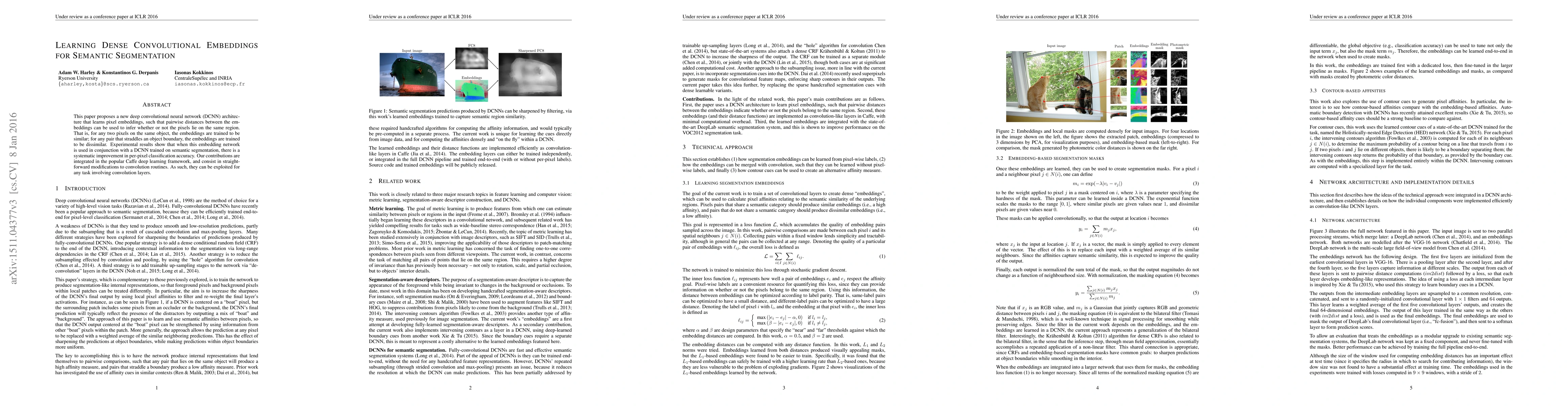 This paper proposes a new deep convolutional neural network architecture that learns pixel embeddings to improve semantic segmentation accuracy. The embedding network is trained to group similar pixels on the same object together.