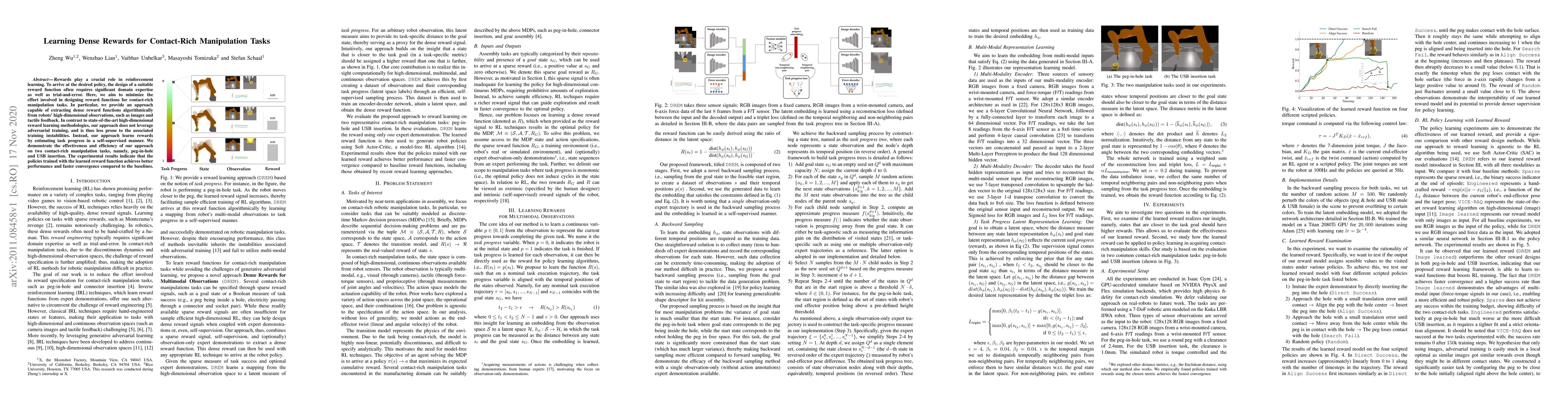 This paper proposes a method for automatically learning dense reward functions from high-dimensional observations for contact-rich manipulation tasks, achieving better performance and faster convergence compared to baselines, without relying on adversarial training. The approach demonstrates effectiveness on peg-in-hole and USB insertion tasks.