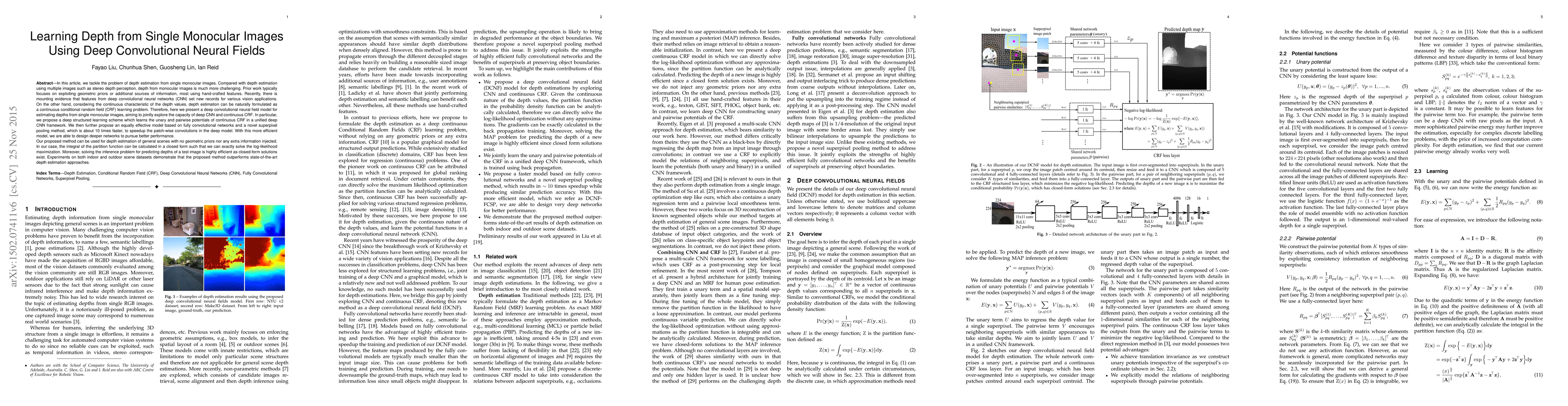 This paper proposes a deep convolutional neural field model to estimate depth from single monocular images, combining deep CNNs with continuous CRFs to outperform existing methods. It also introduces a faster fully convolutional network with superpixel pooling to enhance efficiency while maintaining performance.