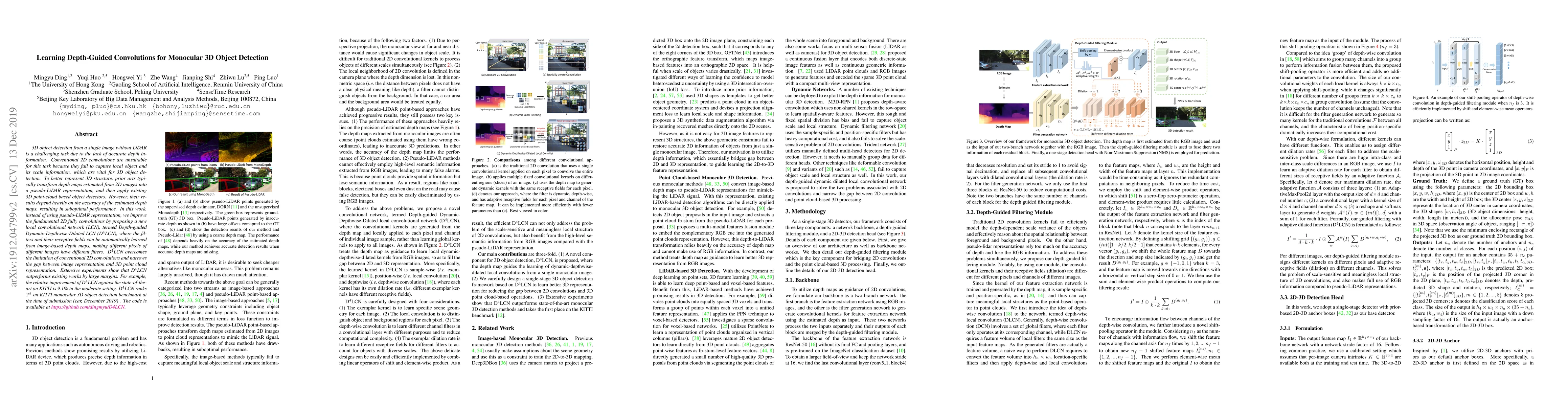 3D object detection from a single image without LiDAR is a challenging task due to the lack of accurate depth information. Conventional 2D convolutions are unsuitable for this task because they fail to capture local object and its scale information, which are vital for 3D object detection. To better represent 3D structure, prior arts typically transform depth maps estimated from 2D images into a pseudo-LiDAR representation, and then apply existing 3D point-cloud based object detectors. However, their results depend heavily on the accuracy of the estimated depth maps, resulting in suboptimal performance. In this work, instead of using pseudo-LiDAR representation, we improve the fundamental 2D fully convolutions by proposing a new local convolutional network (LCN), termed Depth-guided Dynamic-Depthwise-Dilated LCN (D$^4$LCN), where the filters and their receptive fields can be automatically learned from image-based depth maps, making different pixels of different images have different filters. D$^4$LCN overcomes the limitation of conventional 2D convolutions and narrows the gap between image representation and 3D point cloud representation. Extensive experiments show that D$^4$LCN outperforms existing works by large margins. For example, the relative improvement of D$^4$LCN against the state-of-the-art on KITTI is 9.1\% in the moderate setting. The code is available at https://github.com/dingmyu/D4LCN.