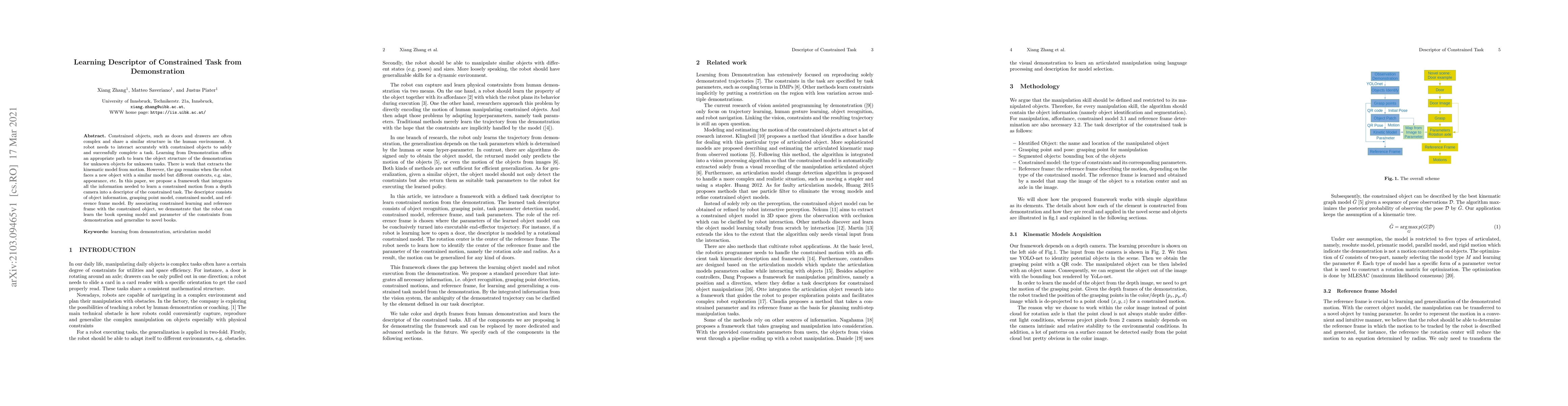 Constrained objects, such as doors and drawers are often complex and share a similar structure in the human environment. A robot needs to interact accurately with constrained objects to safely and successfully complete a task. Learning from Demonstration offers an appropriate path to learn the object structure of the demonstration for unknown objects for unknown tasks. There is work that extracts the kinematic model from motion. However, the gap remains when the robot faces a new object with a similar model but different contexts, e.g. size, appearance, etc. In this paper, we propose a framework that integrates all the information needed to learn a constrained motion from a depth camera into a descriptor of the constrained task. The descriptor consists of object information, grasping point model, constrained model, and reference frame model. By associating constrained learning and reference frame with the constrained object, we demonstrate that the robot can learn the book opening model and parameter of the constraints from demonstration and generalize to novel books.