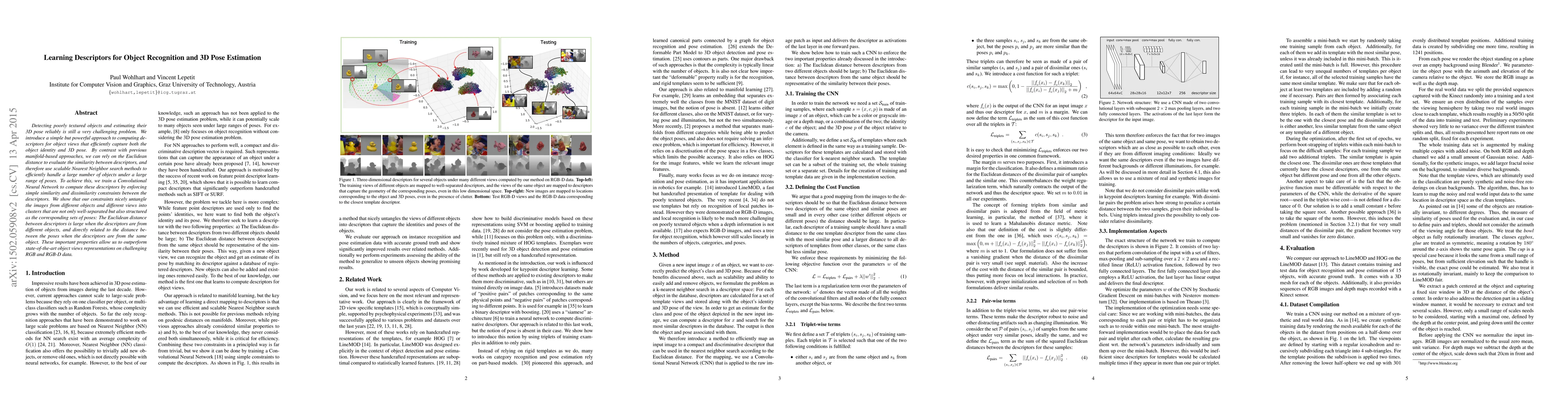 This paper proposes a Convolutional Neural Network-based method for computing object view descriptors that efficiently capture both object identity and 3D pose, enabling scalable Nearest Neighbor search. The trained descriptors exhibit strong separation between different objects and pose distances, outperforming existing methods on RGB and RGB-D data.