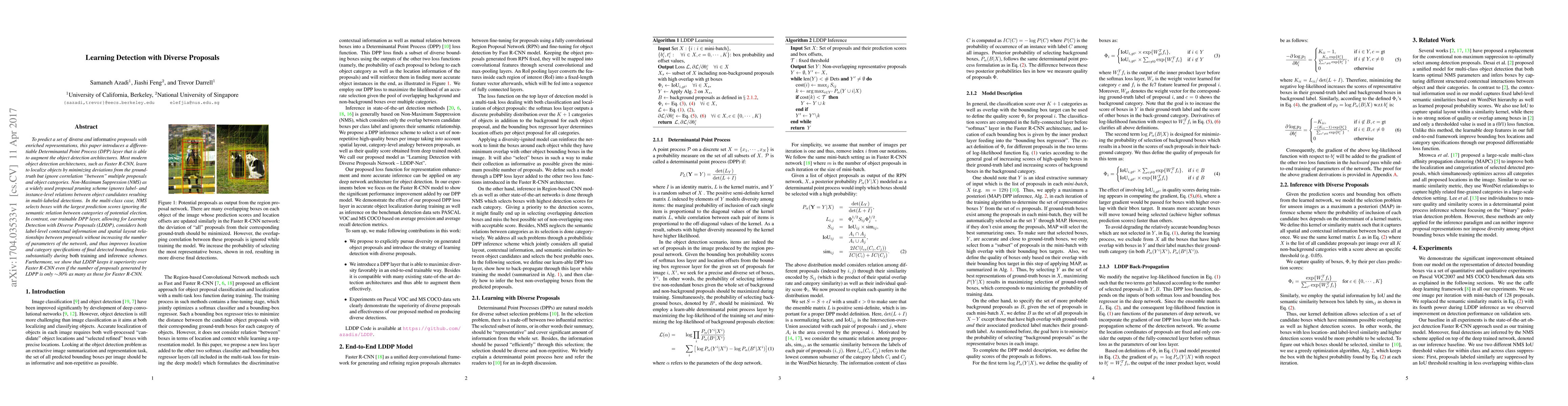 To predict a set of diverse and informative proposals with enriched representations, this paper introduces a differentiable Determinantal Point Process (DPP) layer that is able to augment the object detection architectures. Most modern object detection architectures, such as Faster R-CNN, learn to localize objects by minimizing deviations from the ground-truth but ignore correlation between multiple proposals and object categories. Non-Maximum Suppression (NMS) as a widely used proposal pruning scheme ignores label- and instance-level relations between object candidates resulting in multi-labeled detections. In the multi-class case, NMS selects boxes with the largest prediction scores ignoring the semantic relation between categories of potential election. In contrast, our trainable DPP layer, allowing for Learning Detection with Diverse Proposals (LDDP), considers both label-level contextual information and spatial layout relationships between proposals without increasing the number of parameters of the network, and thus improves location and category specifications of final detected bounding boxes substantially during both training and inference schemes. Furthermore, we show that LDDP keeps it superiority over Faster R-CNN even if the number of proposals generated by LDPP is only ~30% as many as those for Faster R-CNN.