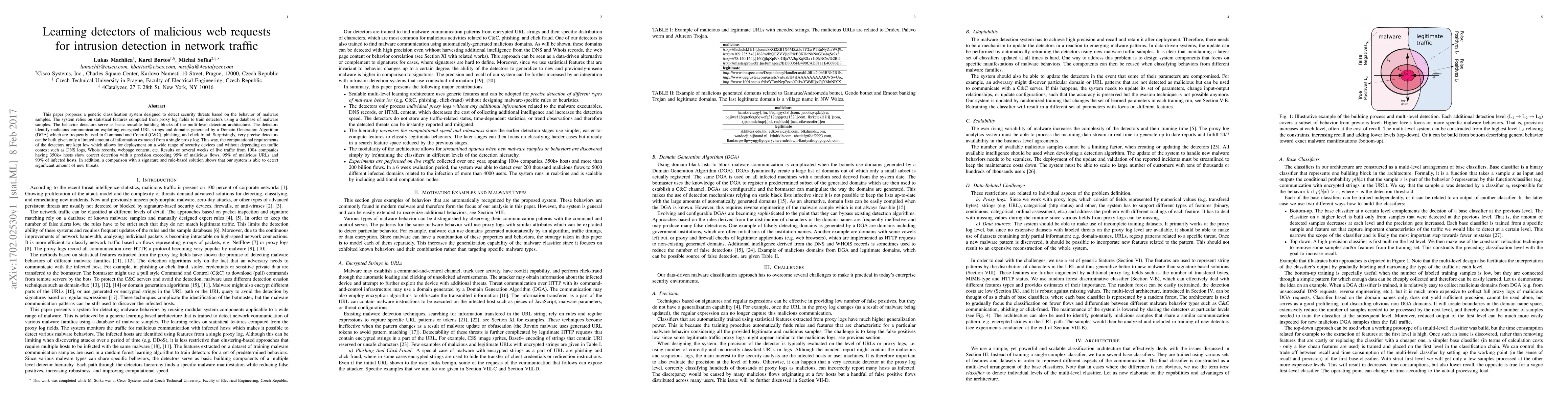 This paper proposes a generic classification system designed to detect security threats based on the behavior of malware samples. The system relies on statistical features computed from proxy log fields to train detectors using a database of malware samples. The behavior detectors serve as basic reusable building blocks of the multi-level detection architecture. The detectors identify malicious communication exploiting encrypted URL strings and domains generated by a Domain Generation Algorithm (DGA) which are frequently used in Command and Control (C&C), phishing, and click fraud. Surprisingly, very precise detectors can be built given only a limited amount of information extracted from a single proxy log. This way, the computational requirements of the detectors are kept low which allows for deployment on a wide range of security devices and without depending on traffic context such as DNS logs, Whois records, webpage content, etc. Results on several weeks of live traffic from 100+ companies having 350k+ hosts show correct detection with a precision exceeding 95% of malicious flows, 95% of malicious URLs and 90% of infected hosts. In addition, a comparison with a signature and rule-based solution shows that our system is able to detect significant amount of new threats.