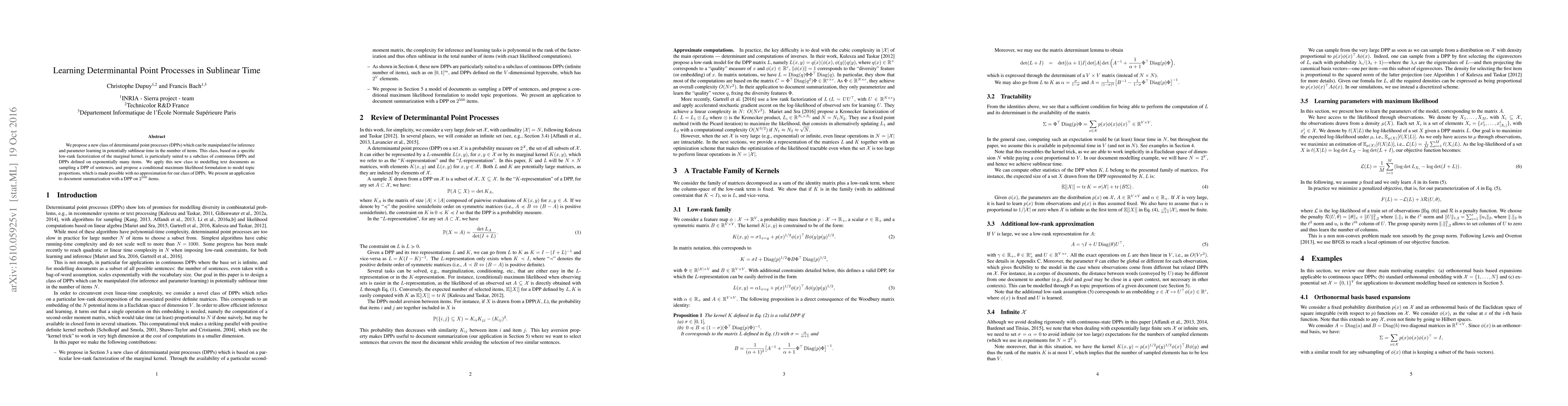 This paper introduces a new class of determinantal point processes (DPPs) that allows for efficient inference and parameter learning in sublinear time, leveraging a low-rank factorization. It applies this to text document modeling and document summarization, demonstrating the ability to handle exponentially large item sets without approximations.