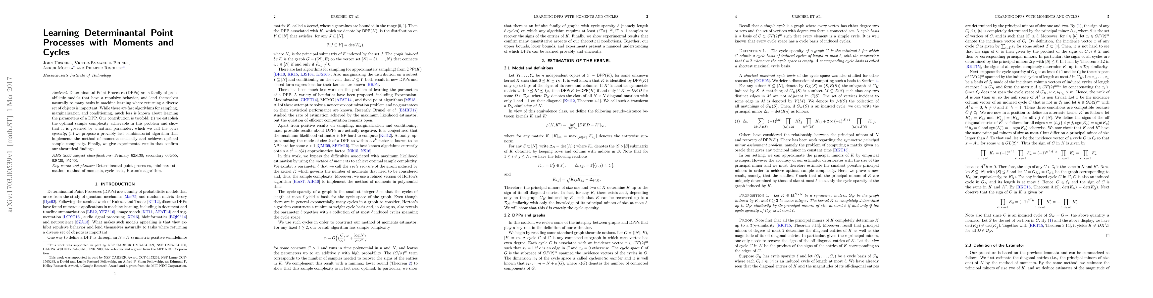 This paper investigates learning parameters for Determinantal Point Processes (DPPs) by establishing optimal sample complexity governed by a new parameter called cycle sparsity and proposing a fast combinatorial algorithm based on the method of moments that achieves this complexity. Experimental results validate the theoretical findings.
