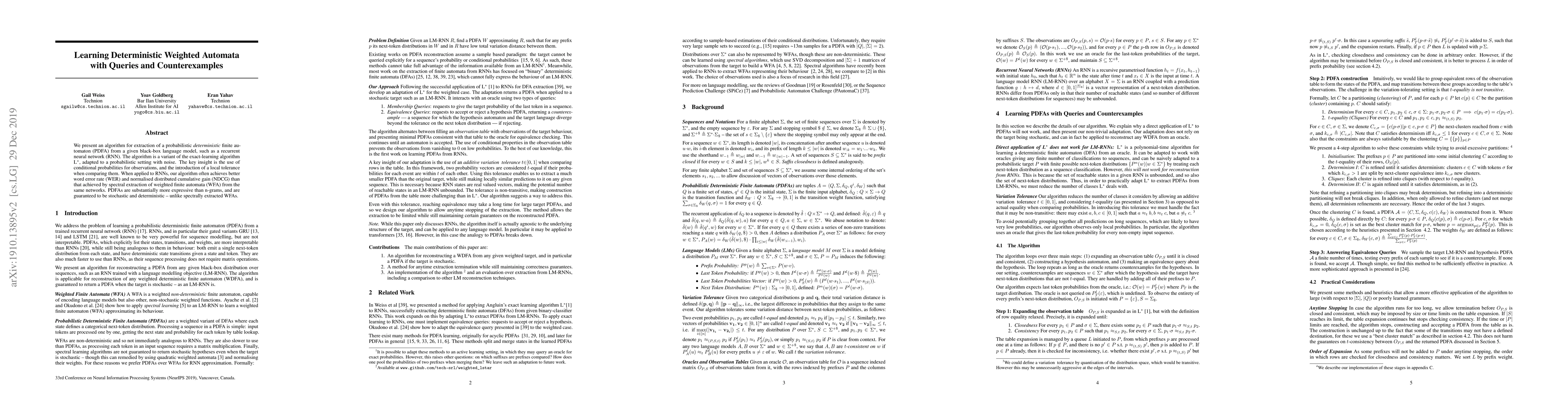 This paper presents an algorithm for extracting a probabilistic deterministic finite automaton (PDFA) from black-box language models like RNNs, improving upon the exact-learning algorithm L* for noisy environments. The method achieves better word error rate and NDCG compared to spectral extraction of weighted finite automata, demonstrating the superior expressiveness and deterministic nature of PDFAs.