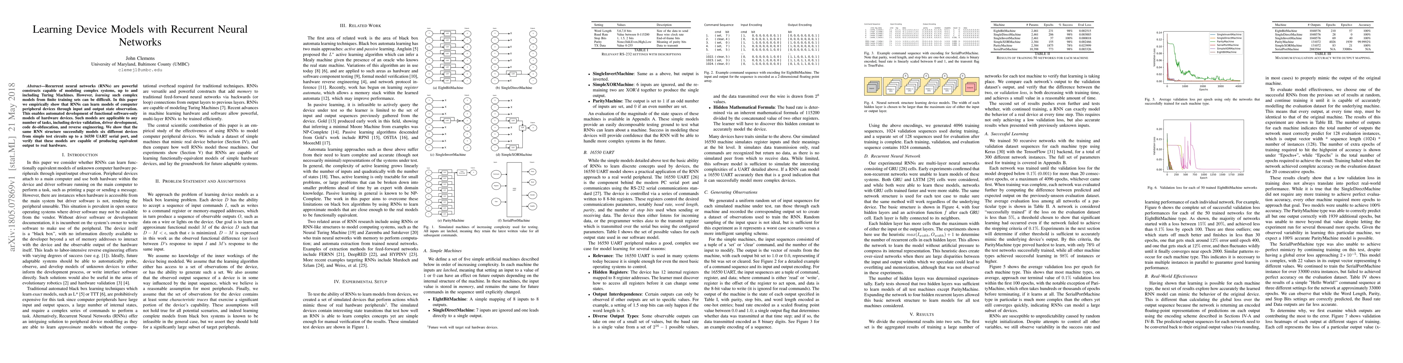 Researchers show that Recurrent Neural Networks can learn software models of hardware devices, enabling tasks like device validation and driver development. They demonstrate this with six different devices using RNN structure and verify the accuracy of these models.