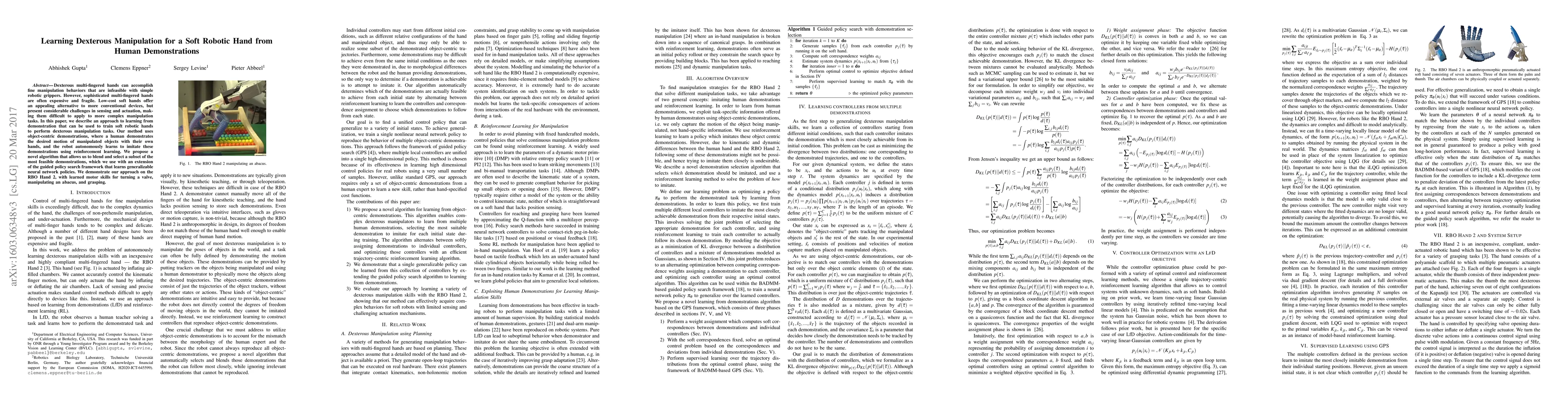 This paper presents a method for training soft robotic hands to perform dexterous manipulation tasks through human demonstration and reinforcement learning. The approach blends and selects feasible demonstrations to learn generalizable neural network policies, demonstrated on the RBO Hand 2 for tasks like turning a valve and grasping.