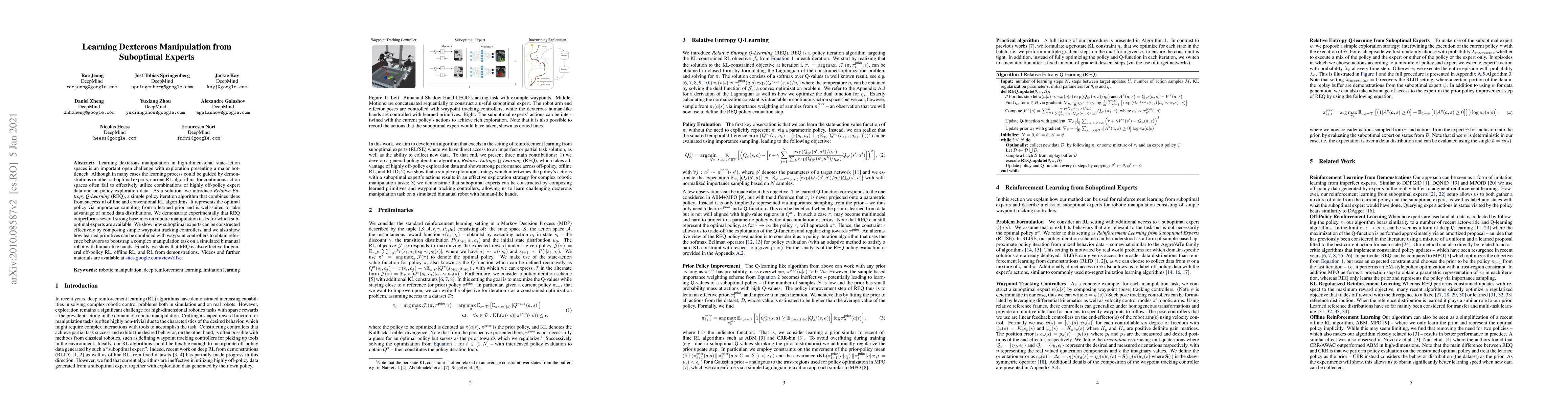 Learning dexterous manipulation in high-dimensional state-action spaces is an important open challenge with exploration presenting a major bottleneck. Although in many cases the learning process could be guided by demonstrations or other suboptimal experts, current RL algorithms for continuous action spaces often fail to effectively utilize combinations of highly off-policy expert data and on-policy exploration data. As a solution, we introduce Relative Entropy Q-Learning (REQ), a simple policy iteration algorithm that combines ideas from successful offline and conventional RL algorithms. It represents the optimal policy via importance sampling from a learned prior and is well-suited to take advantage of mixed data distributions. We demonstrate experimentally that REQ outperforms several strong baselines on robotic manipulation tasks for which suboptimal experts are available. We show how suboptimal experts can be constructed effectively by composing simple waypoint tracking controllers, and we also show how learned primitives can be combined with waypoint controllers to obtain reference behaviors to bootstrap a complex manipulation task on a simulated bimanual robot with human-like hands. Finally, we show that REQ is also effective for general off-policy RL, offline RL, and RL from demonstrations. Videos and further materials are available at sites.google.com/view/rlfse.