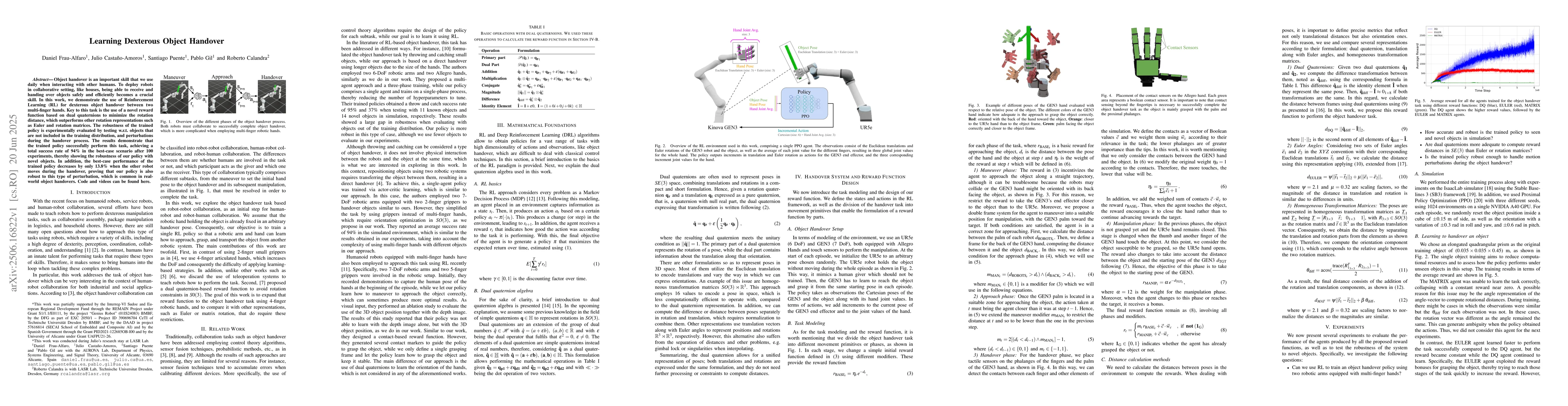 The paper introduces a novel reward function based on dual quaternions for minimizing rotation distances in dexterous object handover tasks, outperforming traditional Euler angles and rotation matrices.