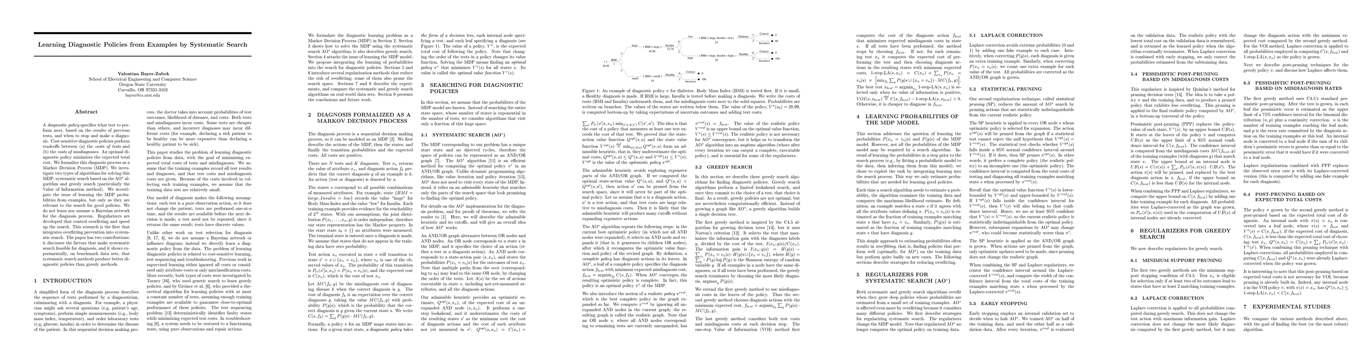 A diagnostic policy specifies what test to perform next, based on the results of previous tests, and when to stop and make a diagnosis. Cost-sensitive diagnostic policies perform tradeoffs between (a) the cost of tests and (b) the cost of misdiagnoses. An optimal diagnostic policy minimizes the expected total cost. We formalize this diagnosis process as a Markov Decision Process (MDP). We investigate two types of algorithms for solving this MDP: systematic search based on AO* algorithm and greedy search (particularly the Value of Information method). We investigate the issue of learning the MDP probabilities from examples, but only as they are relevant to the search for good policies. We do not learn nor assume a Bayesian network for the diagnosis process. Regularizers are developed to control overfitting and speed up the search. This research is the first that integrates overfitting prevention into systematic search. The paper has two contributions: it discusses the factors that make systematic search feasible for diagnosis, and it shows experimentally, on benchmark data sets, that systematic search methods produce better diagnostic policies than greedy methods.