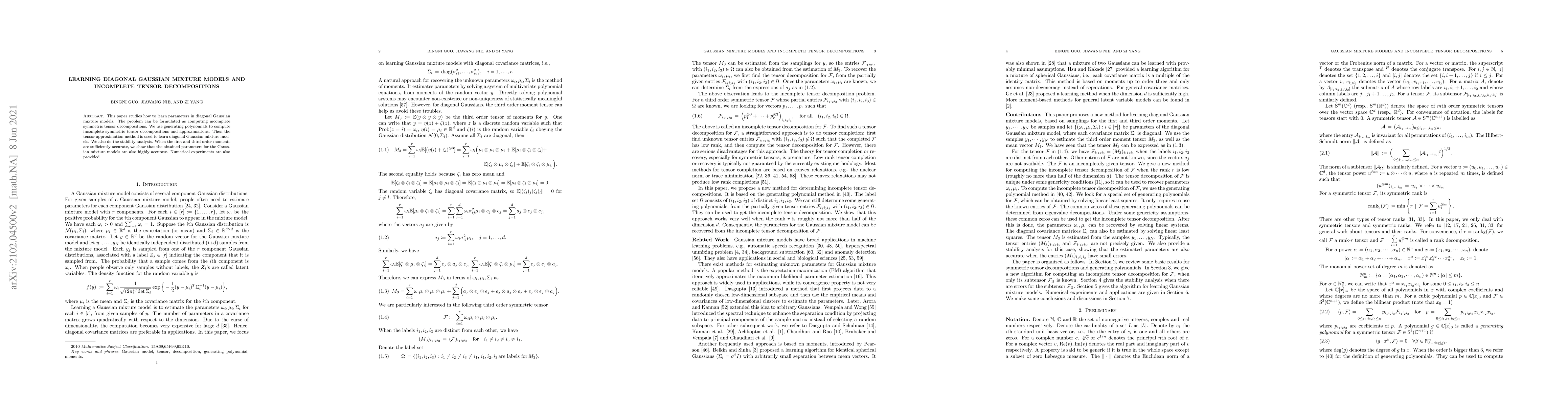 This paper develops methods for learning parameters in diagonal Gaussian mixture models by computing incomplete symmetric tensor decompositions using generating polynomials, and demonstrates stability and accuracy through numerical experiments.