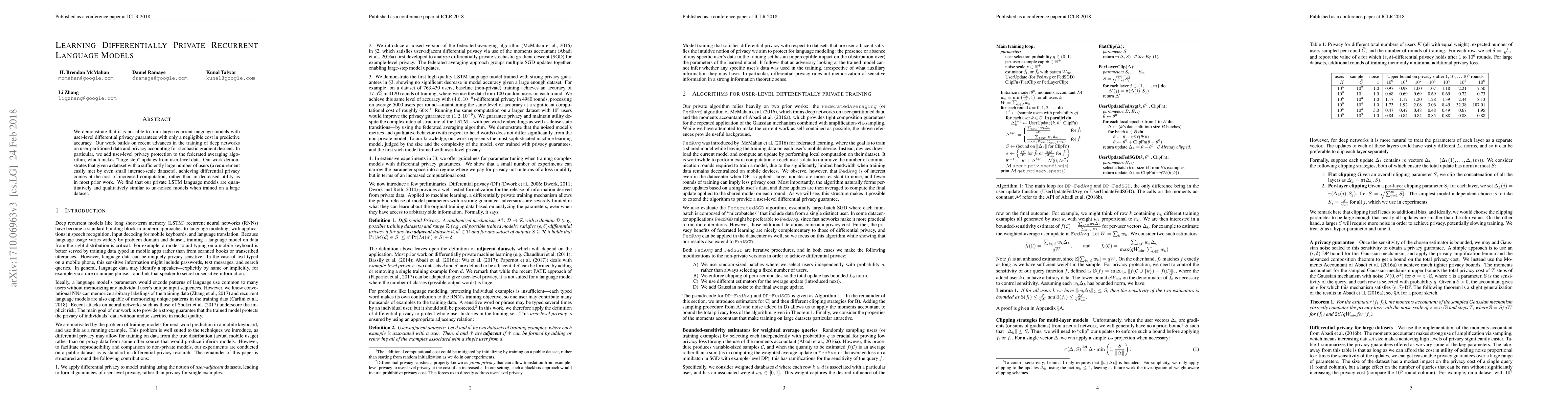 We demonstrate that it is possible to train large recurrent language models with user-level differential privacy guarantees with only a negligible cost in predictive accuracy. Our work builds on recent advances in the training of deep networks on user-partitioned data and privacy accounting for stochastic gradient descent. In particular, we add user-level privacy protection to the federated averaging algorithm, which makes "large step" updates from user-level data. Our work demonstrates that given a dataset with a sufficiently large number of users (a requirement easily met by even small internet-scale datasets), achieving differential privacy comes at the cost of increased computation, rather than in decreased utility as in most prior work. We find that our private LSTM language models are quantitatively and qualitatively similar to un-noised models when trained on a large dataset.