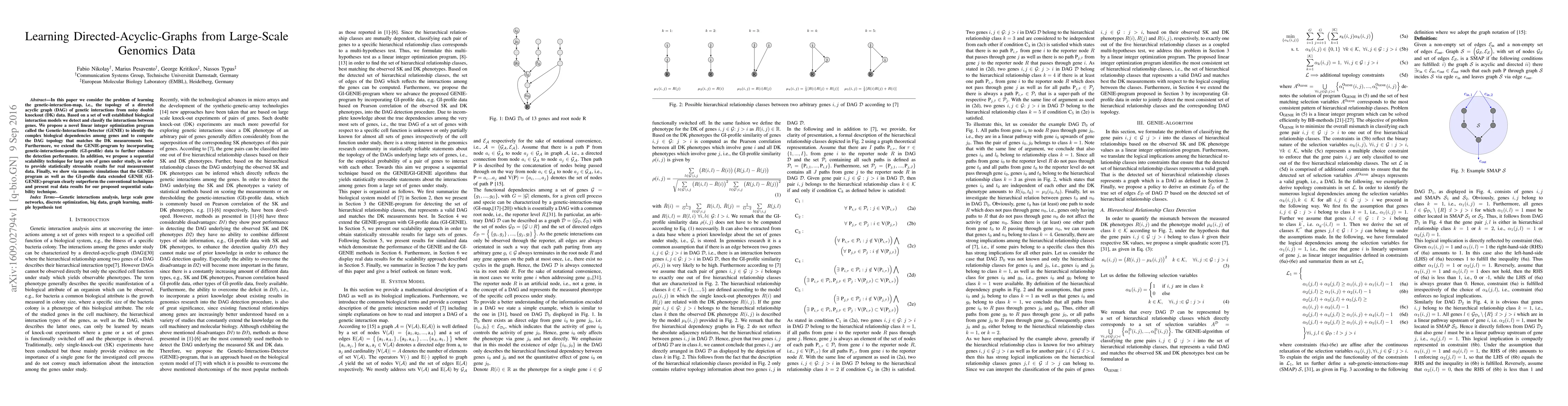 In this paper we consider the problem of learning the genetic-interaction-map, i.e., the topology of a directed acyclic graph (DAG) of genetic interactions from noisy double knockout (DK) data. Based on a set of well established biological interaction models we detect and classify the interactions between genes. We propose a novel linear integer optimization program called the Genetic-Interactions-Detector (GENIE) to identify the complex biological dependencies among genes and to compute the DAG topology that matches the DK measurements best. Furthermore, we extend the GENIE-program by incorporating genetic-interactions-profile (GI-profile) data to further enhance the detection performance. In addition, we propose a sequential scalability technique for large sets of genes under study, in order to provide statistically stressable results for real measurement data. Finally, we show via numeric simulations that the GENIE-program as well as the GI-profile data extended GENIE (GI-GENIE)-program clearly outperform the conventional techniques and present real data results for our proposed sequential scalability technique.