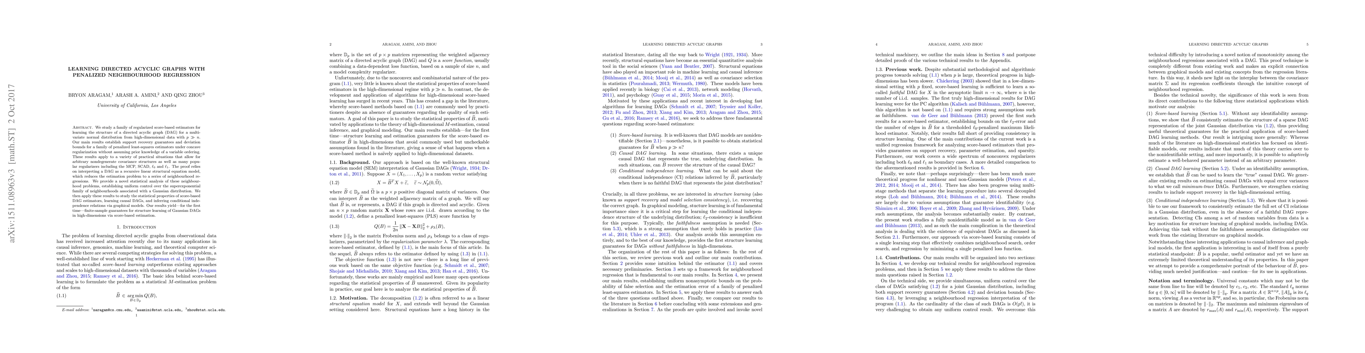 We study a family of regularized score-based estimators for learning the structure of a directed acyclic graph (DAG) for a multivariate normal distribution from high-dimensional data with $p\gg n$. Our main results establish support recovery guarantees and deviation bounds for a family of penalized least-squares estimators under concave regularization without assuming prior knowledge of a variable ordering. These results apply to a variety of practical situations that allow for arbitrary nondegenerate covariance structures as well as many popular regularizers including the MCP, SCAD, $\ell_{0}$ and $\ell_{1}$. The proof relies on interpreting a DAG as a recursive linear structural equation model, which reduces the estimation problem to a series of neighbourhood regressions. We provide a novel statistical analysis of these neighbourhood problems, establishing uniform control over the superexponential family of neighbourhoods associated with a Gaussian distribution. We then apply these results to study the statistical properties of score-based DAG estimators, learning causal DAGs, and inferring conditional independence relations via graphical models. Our results yield---for the first time---finite-sample guarantees for structure learning of Gaussian DAGs in high-dimensions via score-based estimation.