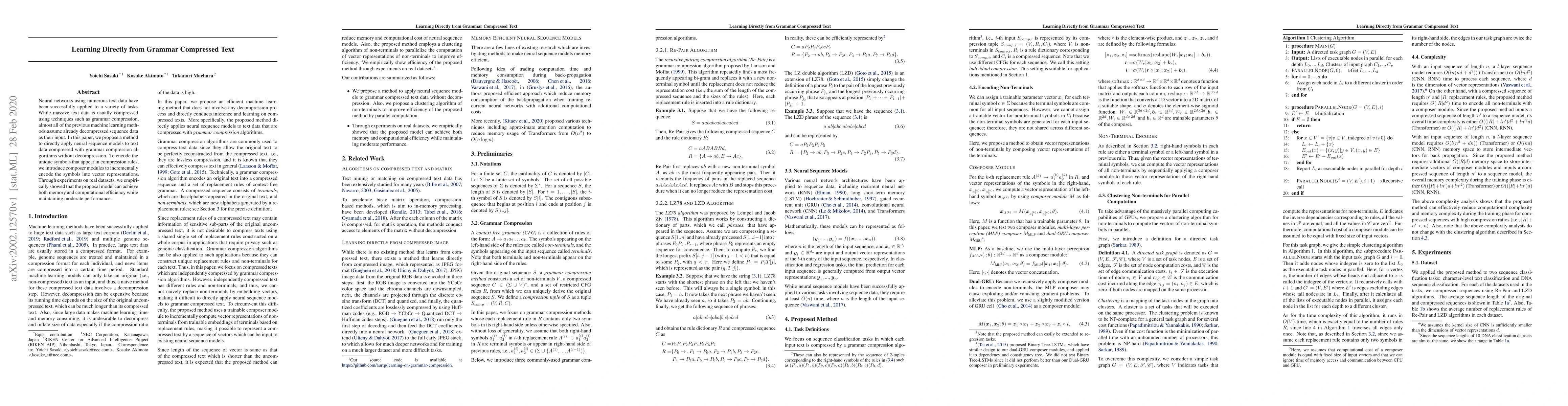 Neural networks using numerous text data have been successfully applied to a variety of tasks. While massive text data is usually compressed using techniques such as grammar compression, almost all of the previous machine learning methods assume already decompressed sequence data as their input. In this paper, we propose a method to directly apply neural sequence models to text data compressed with grammar compression algorithms without decompression. To encode the unique symbols that appear in compression rules, we introduce composer modules to incrementally encode the symbols into vector representations. Through experiments on real datasets, we empirically showed that the proposal model can achieve both memory and computational efficiency while maintaining moderate performance.