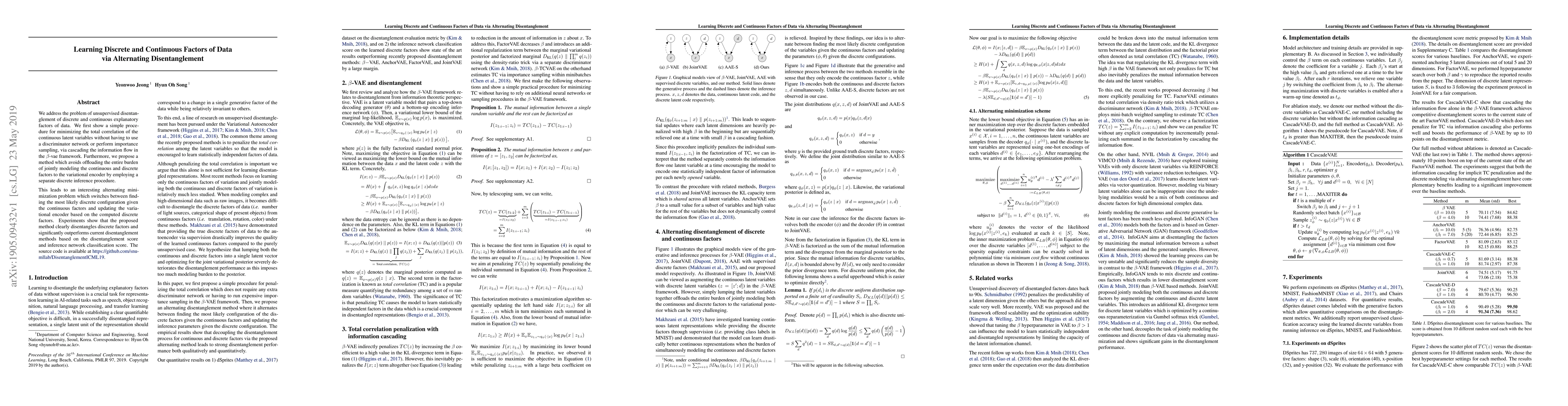 We address the problem of unsupervised disentanglement of discrete and continuous explanatory factors of data. We first show a simple procedure for minimizing the total correlation of the continuous latent variables without having to use a discriminator network or perform importance sampling, via cascading the information flow in the $\beta$-vae framework. Furthermore, we propose a method which avoids offloading the entire burden of jointly modeling the continuous and discrete factors to the variational encoder by employing a separate discrete inference procedure. This leads to an interesting alternating minimization problem which switches between finding the most likely discrete configuration given the continuous factors and updating the variational encoder based on the computed discrete factors. Experiments show that the proposed method clearly disentangles discrete factors and significantly outperforms current disentanglement methods based on the disentanglement score and inference network classification score. The source code is available at https://github.com/snu-mllab/DisentanglementICML19.