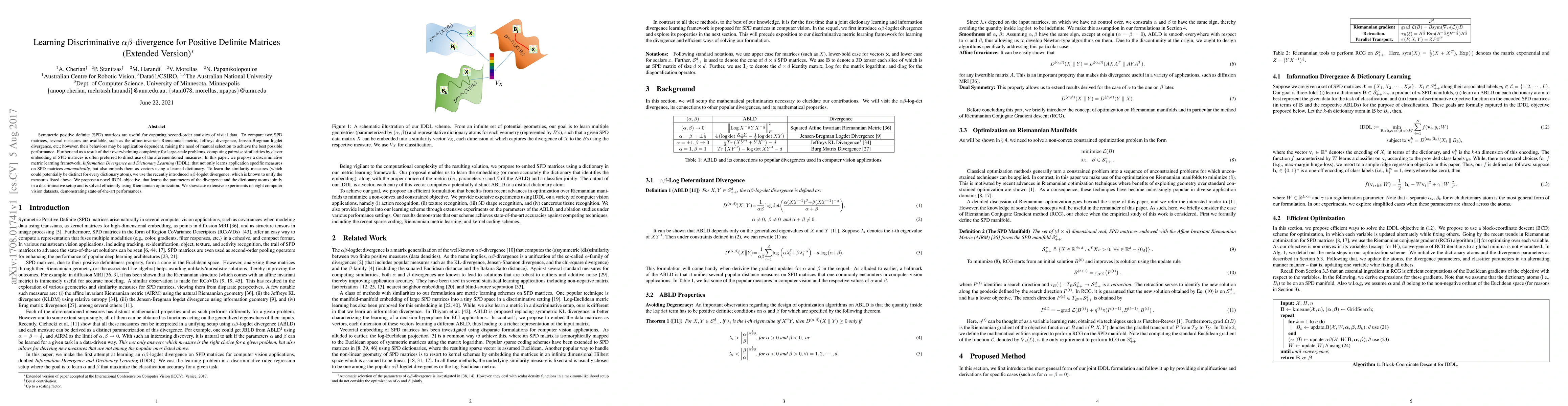This paper proposes a discriminative learning framework, Information Divergence and Dictionary Learning (IDDL), to automatically learn application-specific metrics for comparing symmetric positive definite matrices. It uses the alpha-beta-logdet divergence to unify existing measures and achieves state-of-the-art performance on eight computer vision datasets.