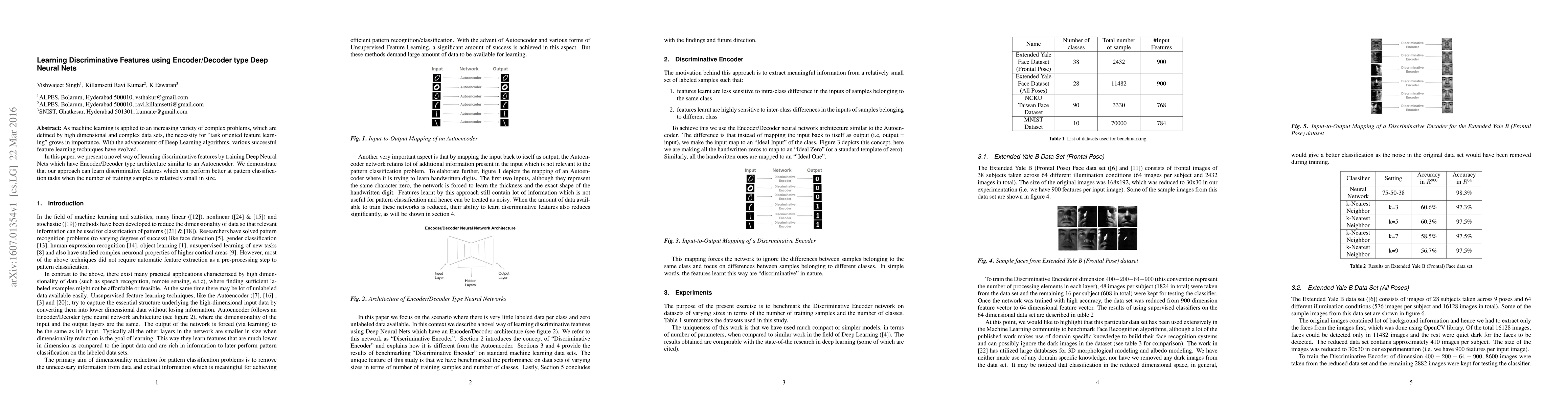 As machine learning is applied to an increasing variety of complex problems, which are defined by high dimensional and complex data sets, the necessity for task oriented feature learning grows in importance. With the advancement of Deep Learning algorithms, various successful feature learning techniques have evolved. In this paper, we present a novel way of learning discriminative features by training Deep Neural Nets which have Encoder or Decoder type architecture similar to an Autoencoder. We demonstrate that our approach can learn discriminative features which can perform better at pattern classification tasks when the number of training samples is relatively small in size.
