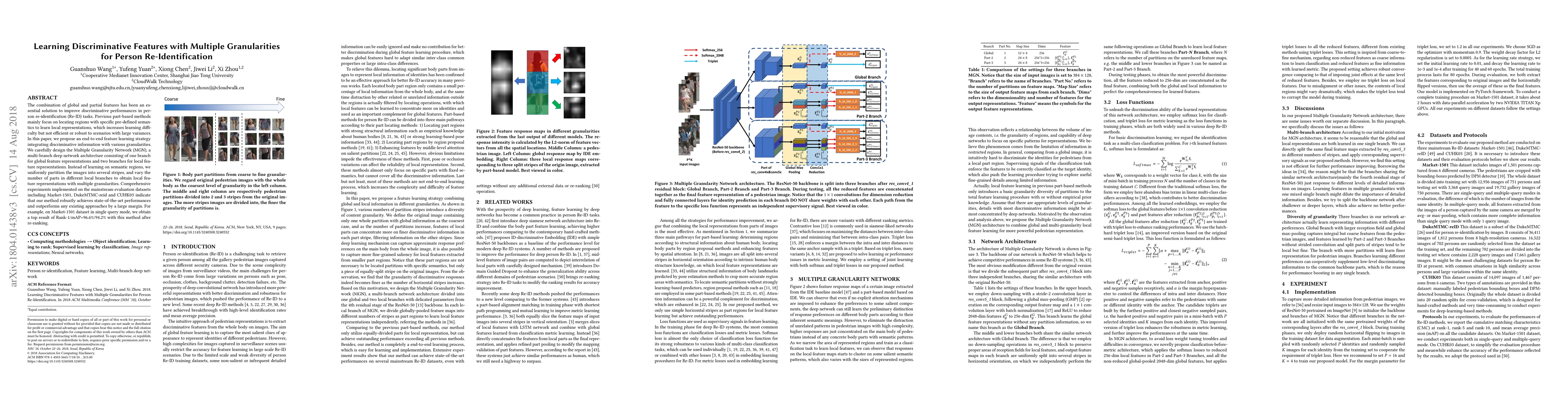 This paper proposes a Multiple Granularity Network (MGN) for person re-identification, integrating global and local features from uniformly partitioned image stripes. The method achieves state-of-the-art performance on several datasets, notably achieving Rank-1/mAP=96.6%/94.2% on Market-1501.