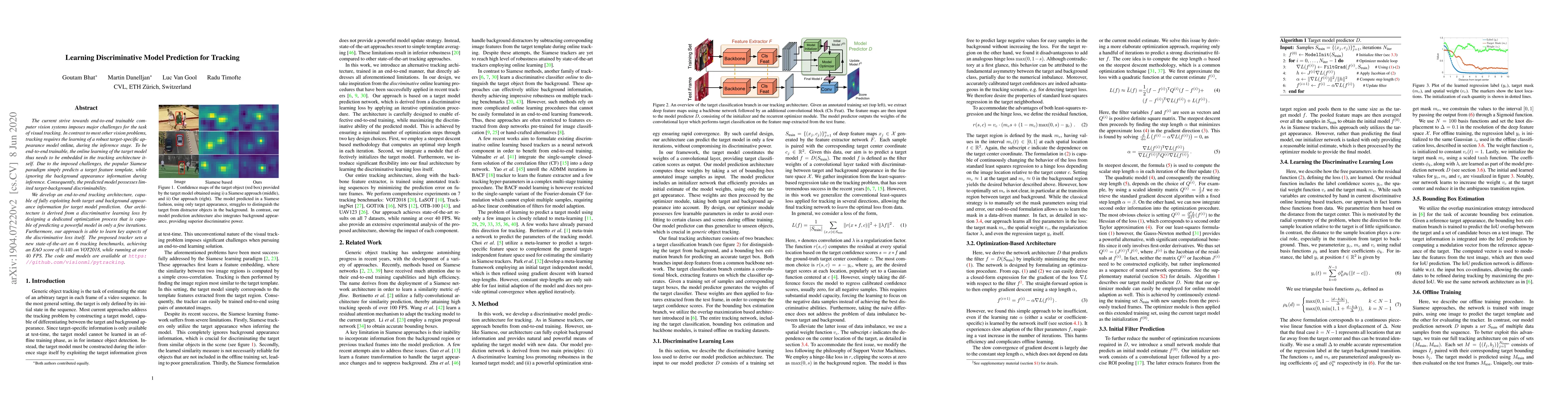 This paper proposes an end-to-end trainable tracking architecture that leverages both target and background information for discriminative model prediction, achieving state-of-the-art performance on multiple benchmarks while maintaining high processing speed.