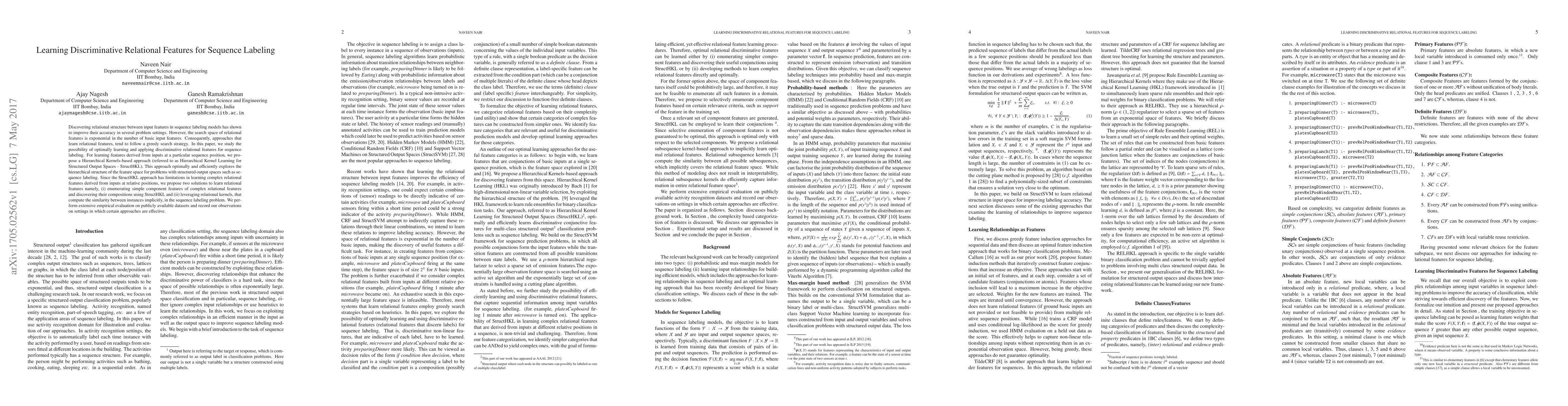 This paper proposes Hierarchical Kernel Learning for Structured Output Spaces (StructHKL) to optimally learn discriminative relational features for sequence labeling, addressing the exponential search space issue. It also introduces two methods to handle complex relational features and evaluates their effectiveness on various datasets.