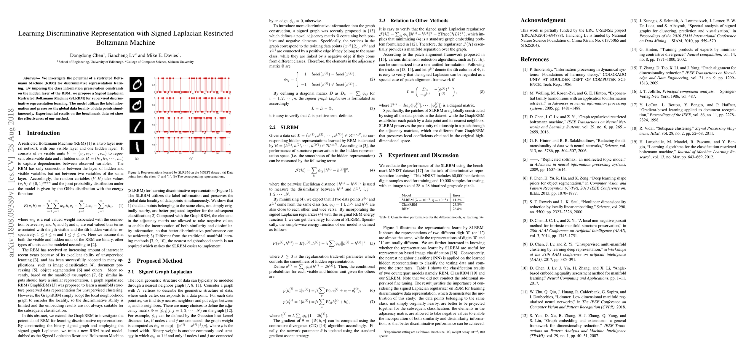The paper proposes a Signed Laplacian Restricted Boltzmann Machine (SLRBM) to improve discriminative representation learning by incorporating class information constraints. Experimental results demonstrate the effectiveness of SLRBM in preserving global data locality while utilizing label information.