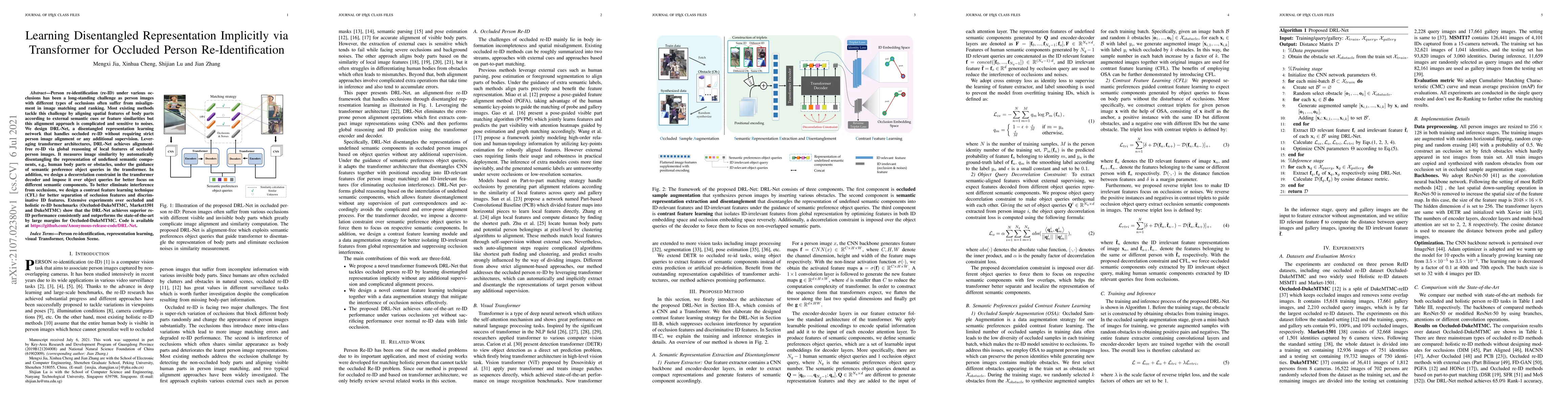 The paper proposes DRL-Net, a transformer-based network for occluded person re-identification that disentangles representations implicitly without requiring image alignment or additional supervision. It leverages global reasoning and a decorrelation constraint to focus on different semantic components, achieving superior performance on occluded re-ID benchmarks.