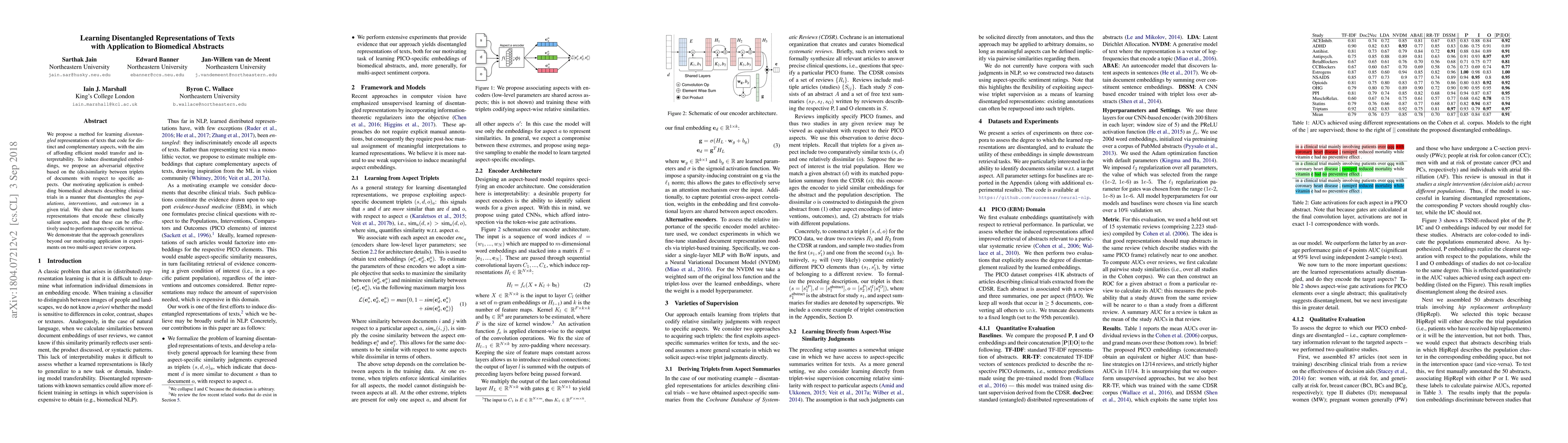 We propose a method for learning disentangled representations of texts that code for distinct and complementary aspects, with the aim of affording efficient model transfer and interpretability. To induce disentangled embeddings, we propose an adversarial objective based on the (dis)similarity between triplets of documents with respect to specific aspects. Our motivating application is embedding biomedical abstracts describing clinical trials in a manner that disentangles the populations, interventions, and outcomes in a given trial. We show that our method learns representations that encode these clinically salient aspects, and that these can be effectively used to perform aspect-specific retrieval. We demonstrate that the approach generalizes beyond our motivating application in experiments on two multi-aspect review corpora.