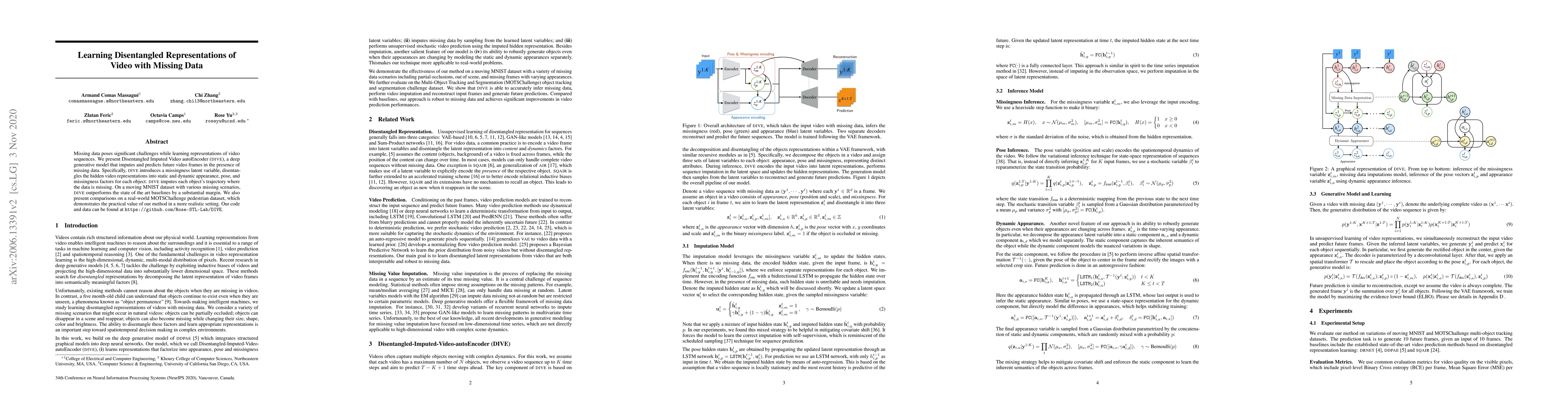 The research introduces Disentangled Imputed Video autoEncoder (DIVE), a deep generative model that imputes and predicts future video frames in the presence of missing data. DIVE introduces a missingness latent variable, disentangles hidden video representations into static and dynamic appearance, pose, and missingness factors for each object, and imputes each object's trajectory where data is missing.