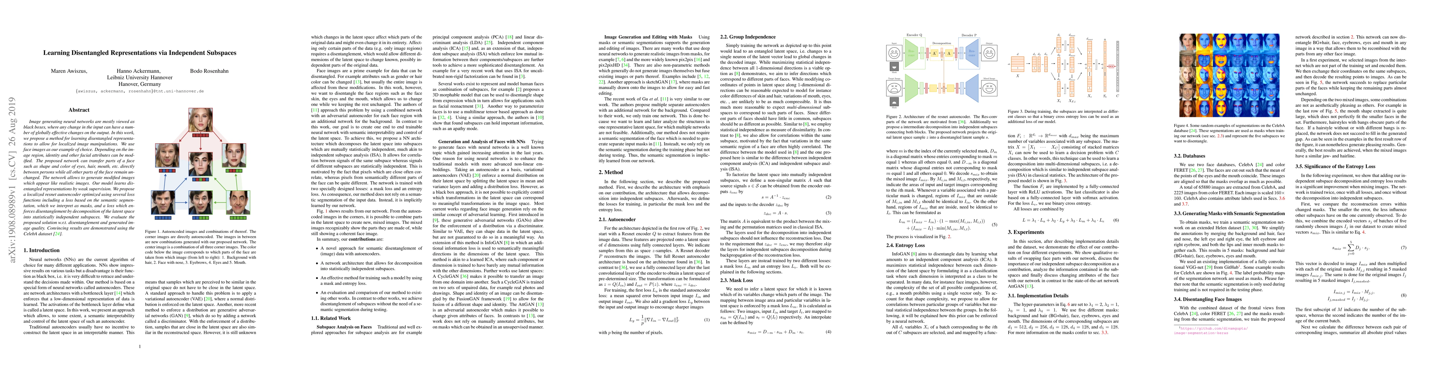 This paper proposes a method to learn disentangled representations in neural networks using independent subspaces for localized image manipulations, particularly in face images. The model employs a localized ResNet autoencoder with losses to enforce semantic segmentation and disentanglement, achieving realistic and modified face images while maintaining other facial parts unchanged.