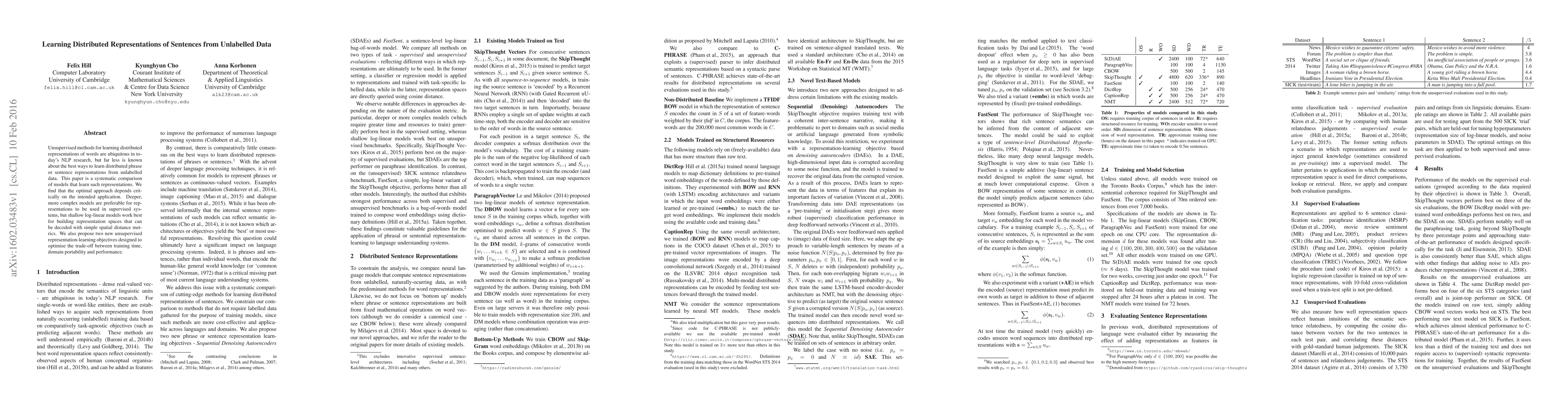 This paper compares unsupervised methods for learning distributed sentence representations, finding that deeper models suit supervised systems while shallow models excel for spatial distance decoding. It also introduces new objectives balancing training time, domain adaptability, and performance.