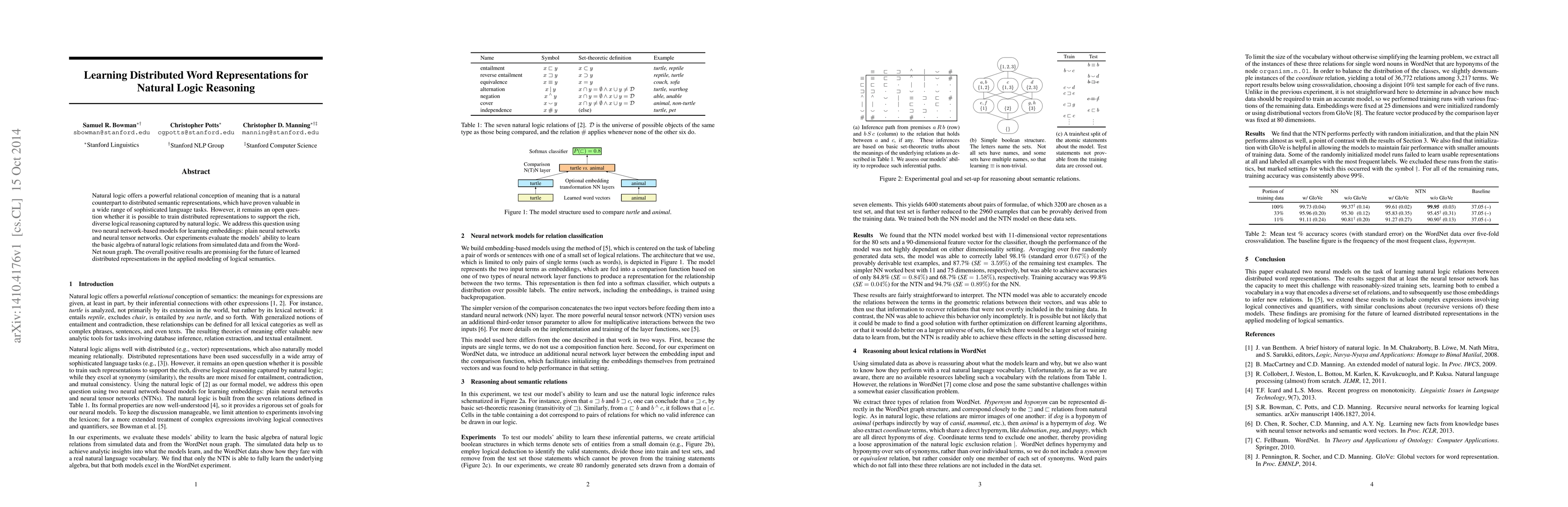 This paper explores the potential of distributed word representations to support natural logic reasoning through neural network models. Experiments show promising results in learning the algebra of natural logic from both simulated data and the WordNet noun graph, suggesting potential for future applications in logical semantics.