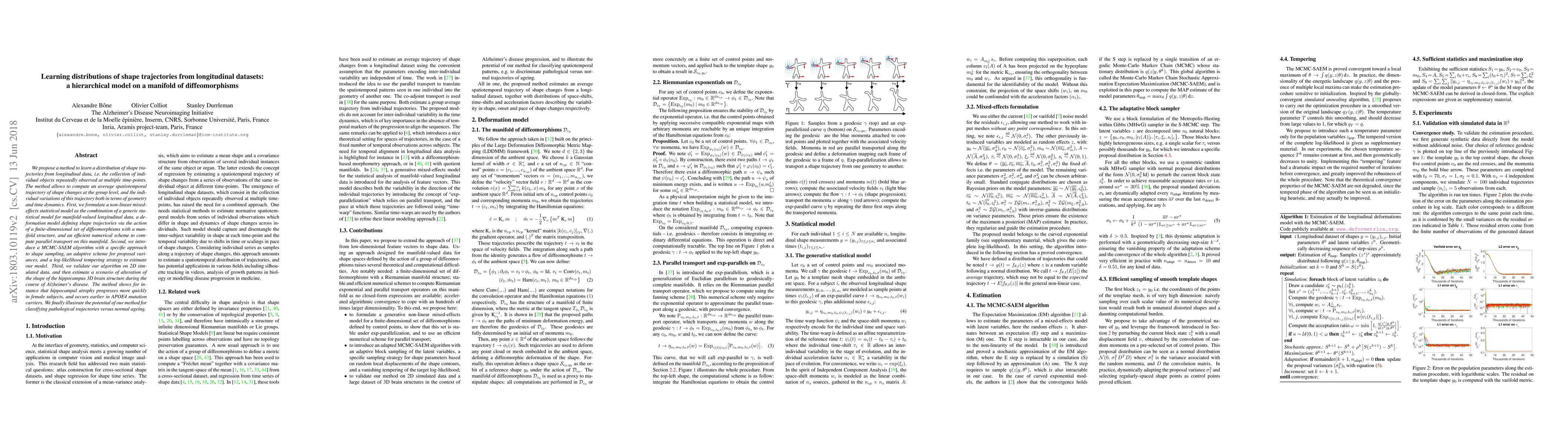 We propose a method to learn a distribution of shape trajectories from longitudinal data, i.e. the collection of individual objects repeatedly observed at multiple time-points. The method allows to compute an average spatiotemporal trajectory of shape changes at the group level, and the individual variations of this trajectory both in terms of geometry and time dynamics. First, we formulate a non-linear mixed-effects statistical model as the combination of a generic statistical model for manifold-valued longitudinal data, a deformation model defining shape trajectories via the action of a finite-dimensional set of diffeomorphisms with a manifold structure, and an efficient numerical scheme to compute parallel transport on this manifold. Second, we introduce a MCMC-SAEM algorithm with a specific approach to shape sampling, an adaptive scheme for proposal variances, and a log-likelihood tempering strategy to estimate our model. Third, we validate our algorithm on 2D simulated data, and then estimate a scenario of alteration of the shape of the hippocampus 3D brain structure during the course of Alzheimer's disease. The method shows for instance that hippocampal atrophy progresses more quickly in female subjects, and occurs earlier in APOE4 mutation carriers. We finally illustrate the potential of our method for classifying pathological trajectories versus normal ageing.