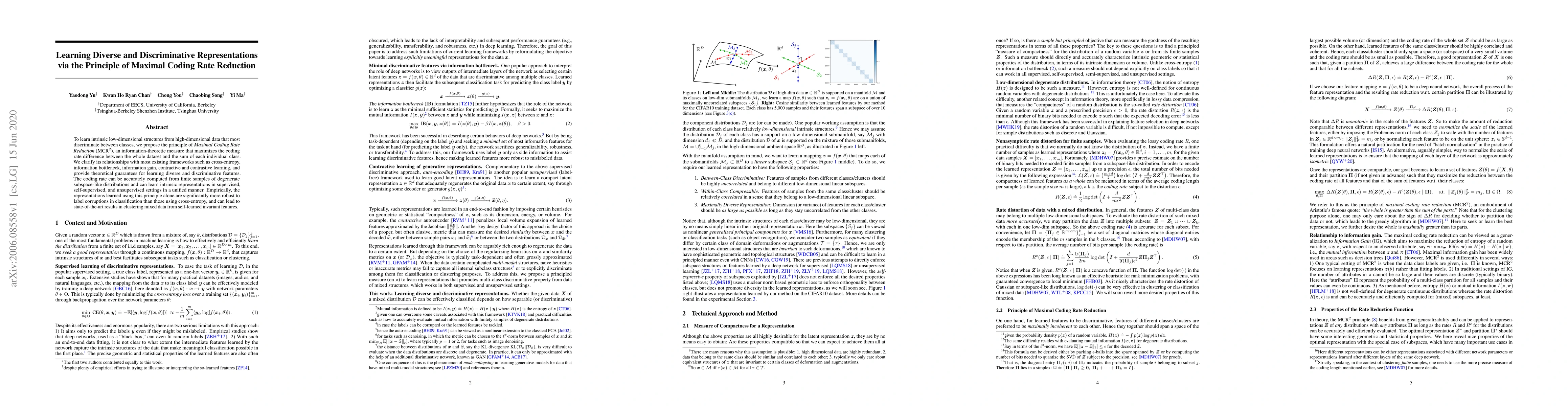 To learn intrinsic low-dimensional structures from high-dimensional data that most discriminate between classes, we propose the principle of Maximal Coding Rate Reduction ($\text{MCR}^2$), an information-theoretic measure that maximizes the coding rate difference between the whole dataset and the sum of each individual class. We clarify its relationships with most existing frameworks such as cross-entropy, information bottleneck, information gain, contractive and contrastive learning, and provide theoretical guarantees for learning diverse and discriminative features. The coding rate can be accurately computed from finite samples of degenerate subspace-like distributions and can learn intrinsic representations in supervised, self-supervised, and unsupervised settings in a unified manner. Empirically, the representations learned using this principle alone are significantly more robust to label corruptions in classification than those using cross-entropy, and can lead to state-of-the-art results in clustering mixed data from self-learned invariant features.
