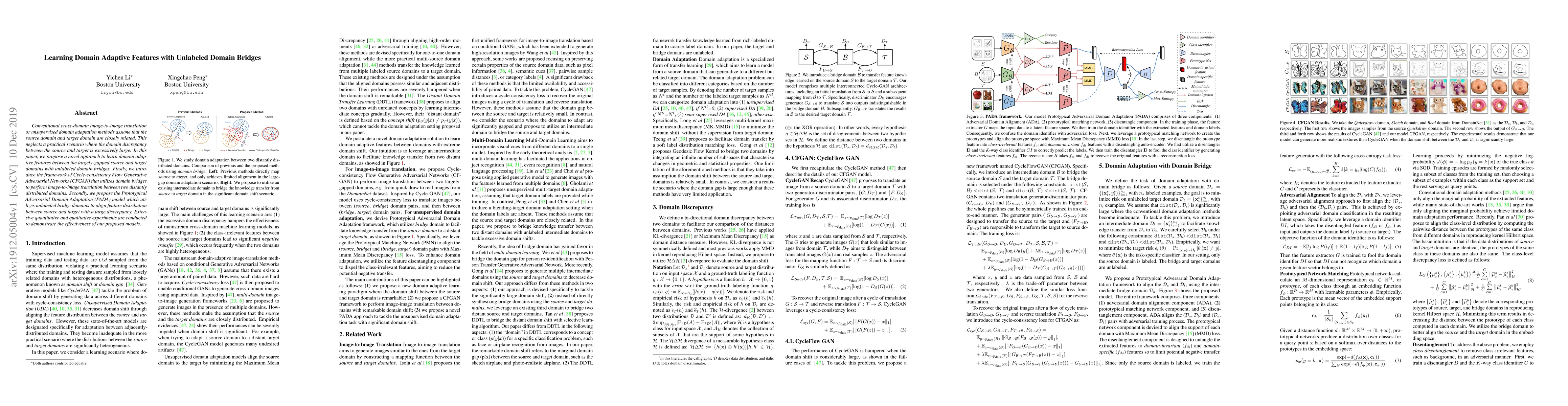 This paper proposes a novel approach using Cycle-consistency Flow Generative Adversarial Networks (CFGAN) and Prototypical Adversarial Domain Adaptation (PADA) to learn domain adaptive features between source and target domains with a large discrepancy, leveraging unlabeled domain bridges for effective image-to-image translation and domain adaptation. Extensive experiments validate the effectiveness of the proposed models.