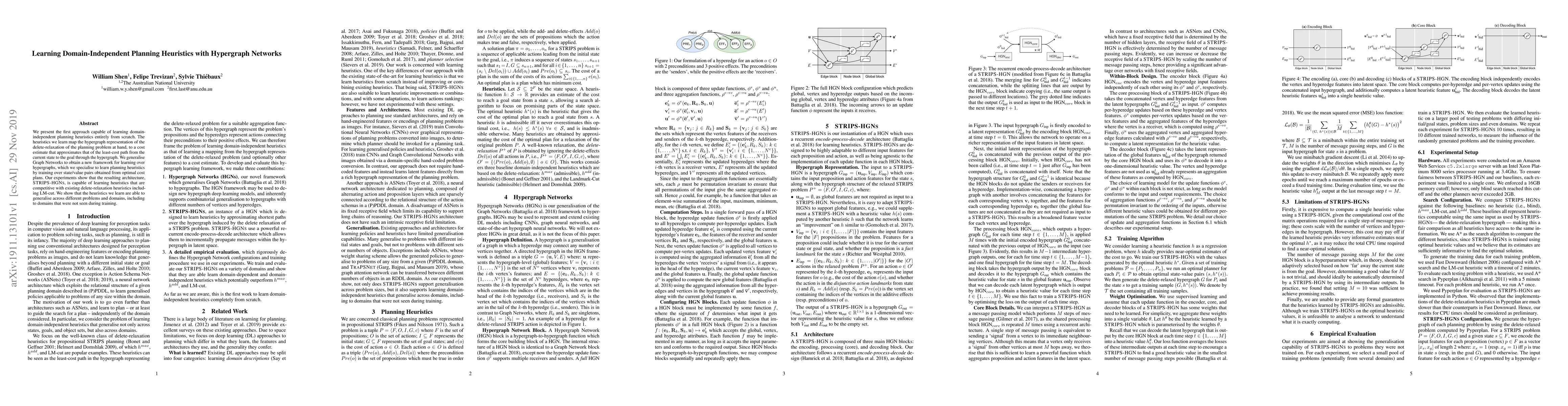 This paper introduces a novel method for learning domain-independent planning heuristics using hypergraph networks. The approach learns to map the hypergraph representation of planning problems to cost estimates, generalizing graph networks for this purpose and achieving competitive heuristics across various domains.