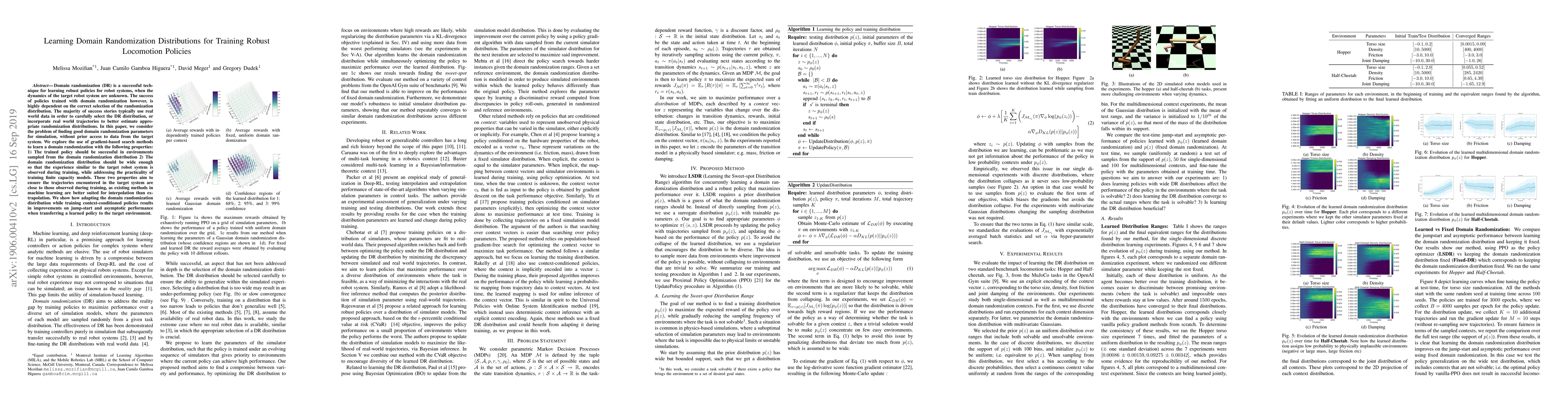 This paper investigates learning optimal domain randomization distributions for training robust locomotion policies without prior knowledge of the target robot system. It employs gradient-based search methods to find a distribution that ensures successful policy performance in the target environment and addresses the challenge of balancing training experience with finite model capacity.