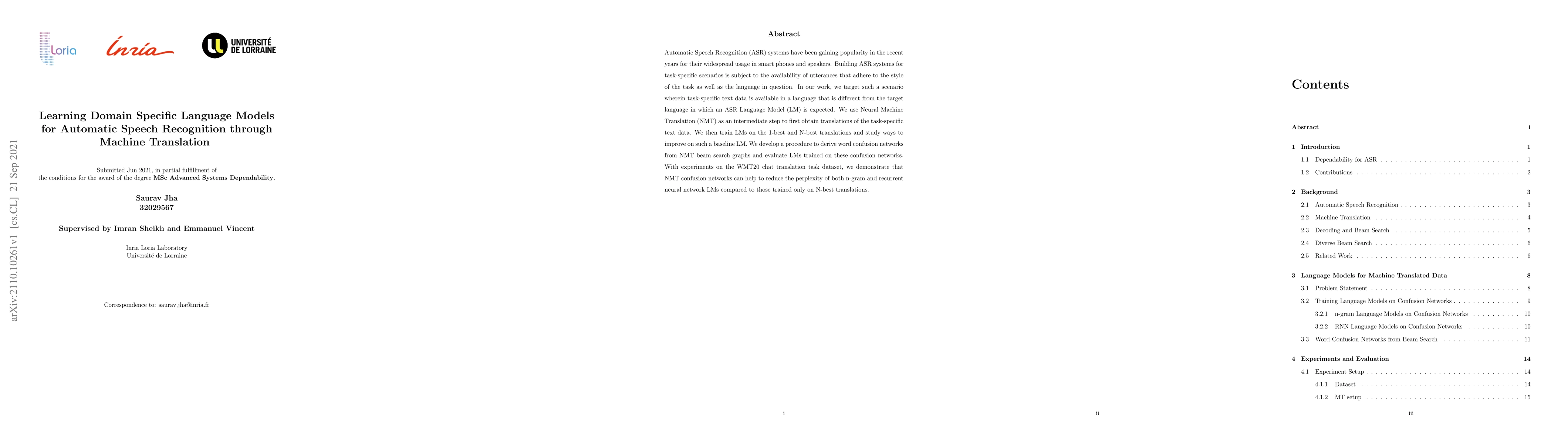 Automatic Speech Recognition (ASR) systems have been gaining popularity in the recent years for their widespread usage in smart phones and speakers. Building ASR systems for task-specific scenarios is subject to the availability of utterances that adhere to the style of the task as well as the language in question. In our work, we target such a scenario wherein task-specific text data is available in a language that is different from the target language in which an ASR Language Model (LM) is expected. We use Neural Machine Translation (NMT) as an intermediate step to first obtain translations of the task-specific text data. We then train LMs on the 1-best and N-best translations and study ways to improve on such a baseline LM. We develop a procedure to derive word confusion networks from NMT beam search graphs and evaluate LMs trained on these confusion networks. With experiments on the WMT20 chat translation task dataset, we demonstrate that NMT confusion networks can help to reduce the perplexity of both n-gram and recurrent neural network LMs compared to those trained only on N-best translations.