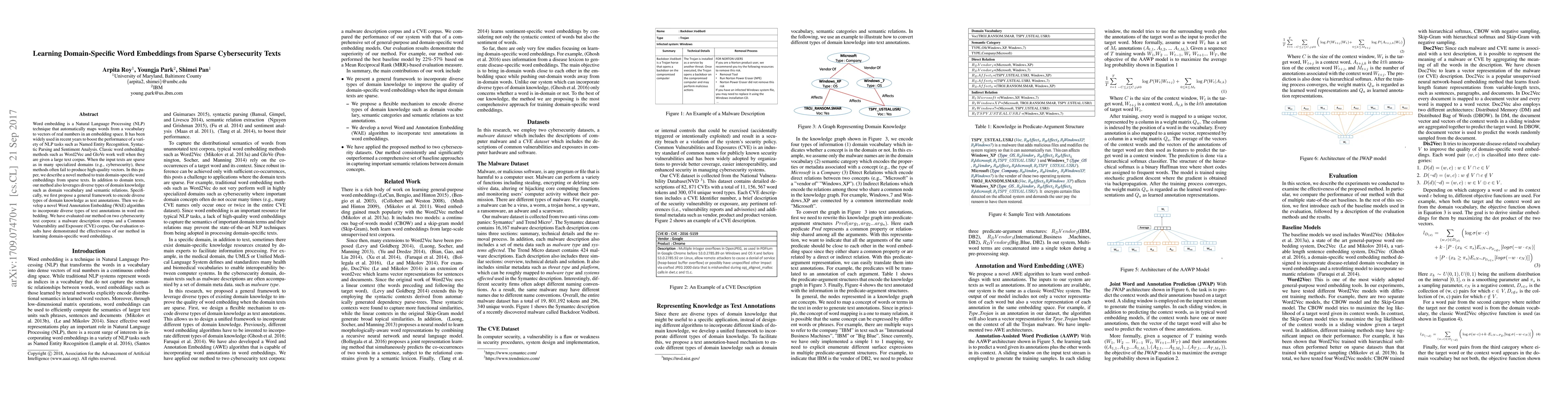 This paper introduces a novel method for training domain-specific word embeddings from sparse cybersecurity texts, leveraging diverse domain knowledge to enhance performance. The proposed Word Annotation Embedding (WAE) algorithm, combined with text annotations, effectively learns embeddings from sparse data, as demonstrated by successful evaluations on malware and CVE corpora.