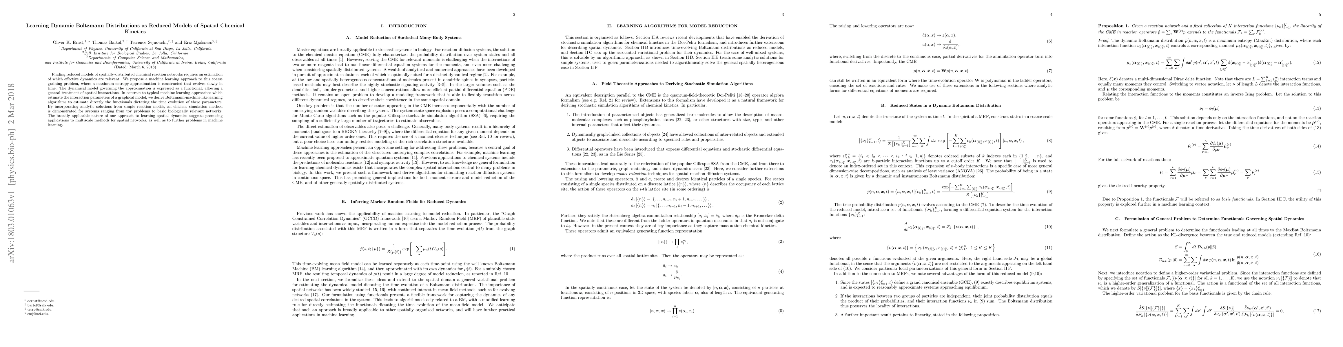 Finding reduced models of spatially-distributed chemical reaction networks requires an estimation of which effective dynamics are relevant. We propose a machine learning approach to this coarse graining problem, where a maximum entropy approximation is constructed that evolves slowly in time. The dynamical model governing the approximation is expressed as a functional, allowing a general treatment of spatial interactions. In contrast to typical machine learning approaches which estimate the interaction parameters of a graphical model, we derive Boltzmann-machine like learning algorithms to estimate directly the functionals dictating the time evolution of these parameters. By incorporating analytic solutions from simple reaction motifs, an efficient simulation method is demonstrated for systems ranging from toy problems to basic biologically relevant networks. The broadly applicable nature of our approach to learning spatial dynamics suggests promising applications to multiscale methods for spatial networks, as well as to further problems in machine learning.