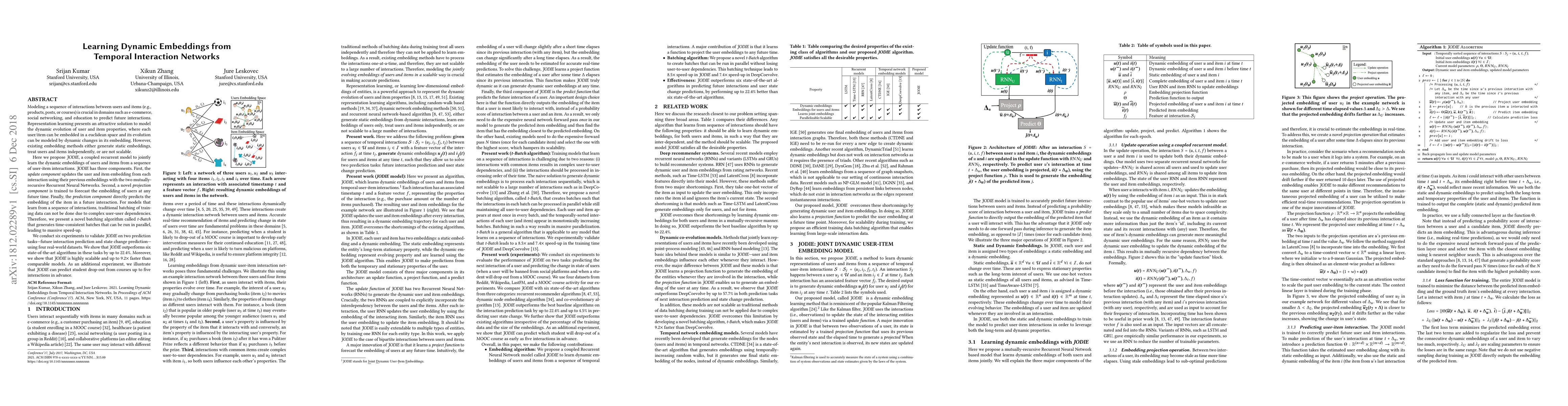 JODIE is a coupled recurrent model that jointly learns dynamic embeddings for users and items from sequences of interactions, outperforming existing methods in future interaction and state change prediction tasks. It employs a novel t-Batch algorithm for efficient training and achieves up to 9.2x faster scalability.