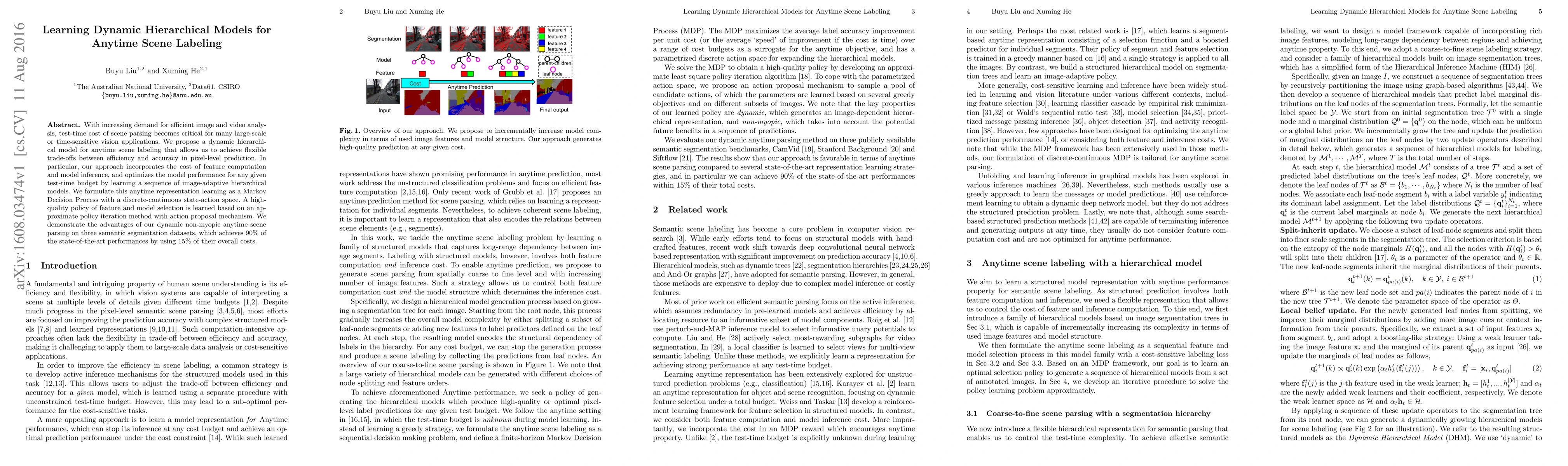 This paper proposes a dynamic hierarchical model for efficient scene labeling that balances efficiency and accuracy by optimizing for any given test-time budget. The approach uses a Markov Decision Process to learn adaptive models, achieving near state-of-the-art performance at a fraction of the computational cost.