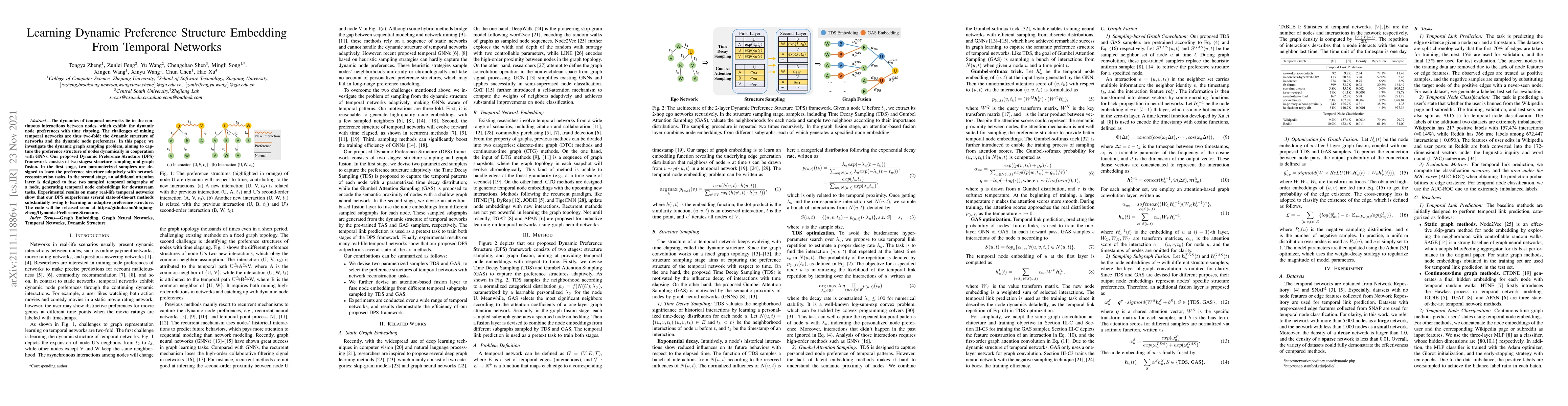 This paper proposes a Dynamic Preference Structure (DPS) framework to capture dynamic node preferences in temporal networks using graph neural networks (GNNs). The DPS framework includes adaptive structure sampling and graph fusion with attention layers, achieving superior performance over state-of-the-art methods on real-life temporal networks.