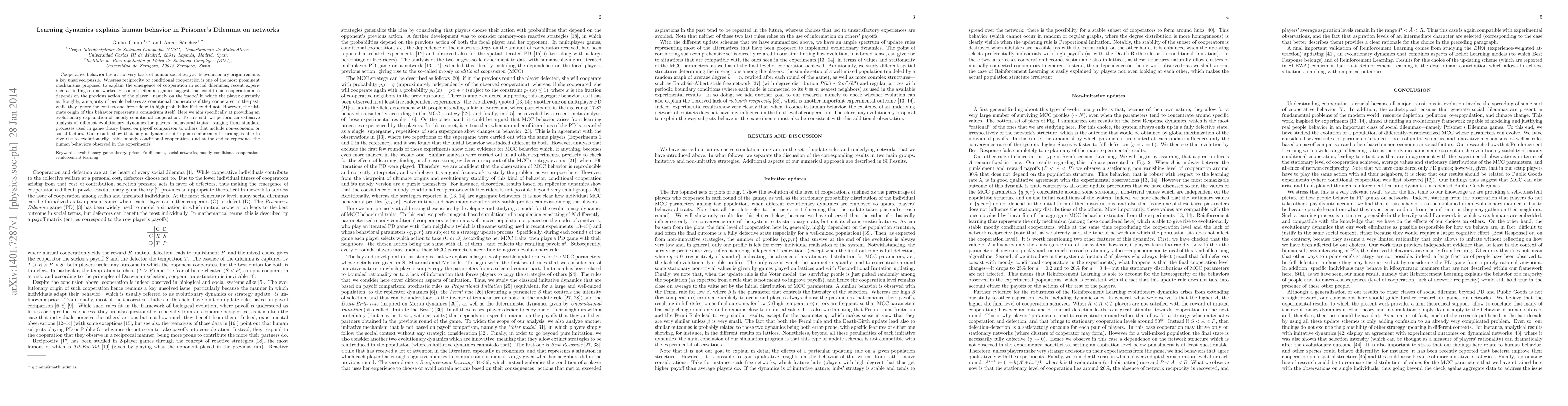 This paper investigates the evolutionary basis of human cooperative behavior in networked Prisoner's Dilemma games, finding that moody conditional cooperation emerges from reinforcement learning dynamics rather than traditional payoff-based processes. The study demonstrates that reinforcement learning can reproduce observed human behaviors in these social dilemma scenarios.
