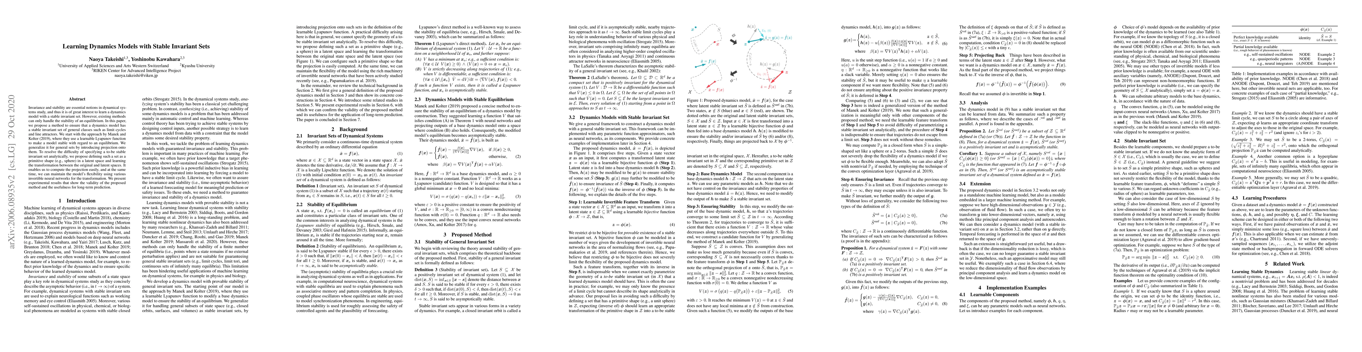 This paper proposes a method to learn dynamics models with stable invariant sets, such as limit cycles and line attractors, by generalizing the approach of using a learnable Lyapunov function. It introduces a transformation between original and latent spaces to define and project invariant sets, enabling long-term prediction.