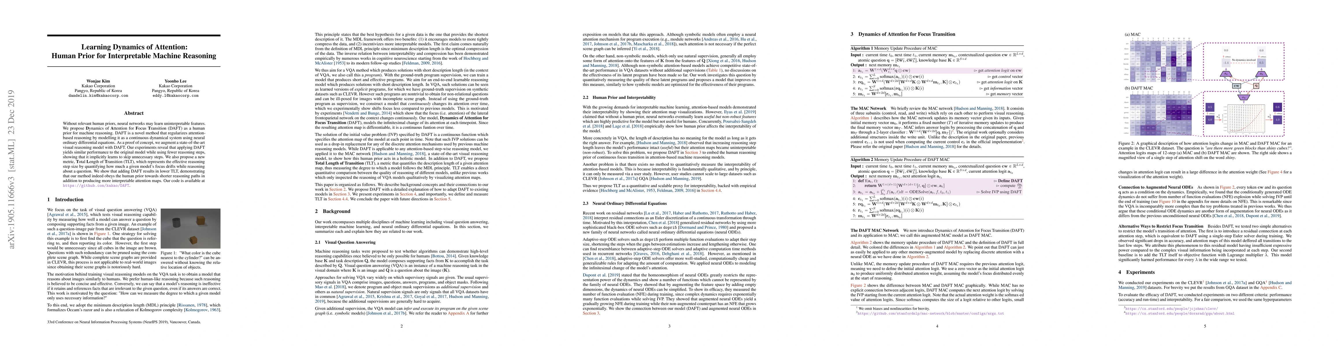 Without relevant human priors, neural networks may learn uninterpretable features. We propose Dynamics of Attention for Focus Transition (DAFT) as a human prior for machine reasoning. DAFT is a novel method that regularizes attention-based reasoning by modelling it as a continuous dynamical system using neural ordinary differential equations. As a proof of concept, we augment a state-of-the-art visual reasoning model with DAFT. Our experiments reveal that applying DAFT yields similar performance to the original model while using fewer reasoning steps, showing that it implicitly learns to skip unnecessary steps. We also propose a new metric, Total Length of Transition (TLT), which represents the effective reasoning step size by quantifying how much a given model's focus drifts while reasoning about a question. We show that adding DAFT results in lower TLT, demonstrating that our method indeed obeys the human prior towards shorter reasoning paths in addition to producing more interpretable attention maps. Our code is available at https://github.com/kakao/DAFT.
