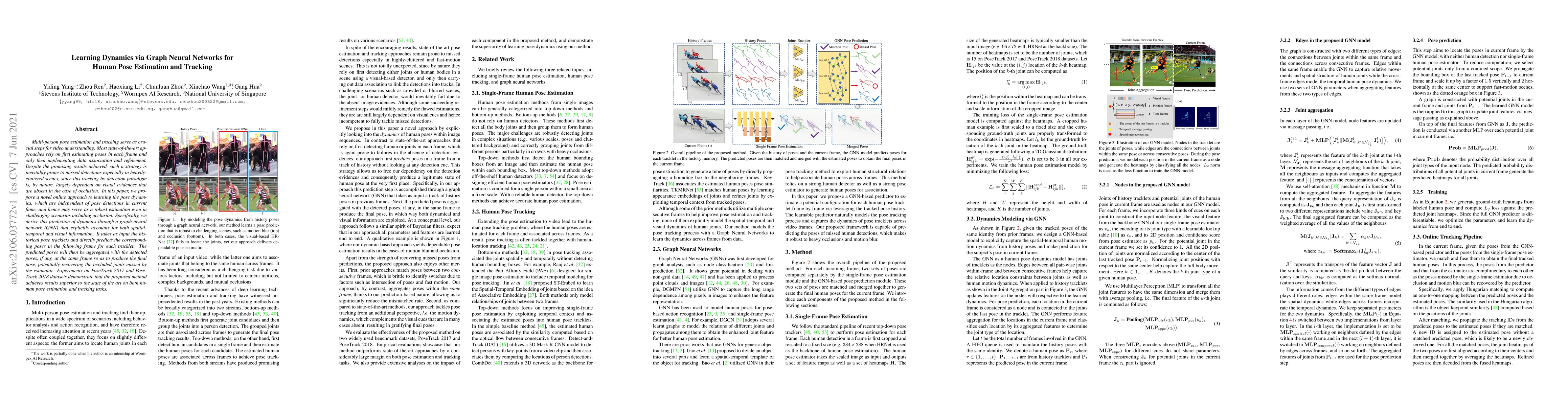 Multi-person pose estimation and tracking serve as crucial steps for video understanding. Most state-of-the-art approaches rely on first estimating poses in each frame and only then implementing data association and refinement. Despite the promising results achieved, such a strategy is inevitably prone to missed detections especially in heavily-cluttered scenes, since this tracking-by-detection paradigm is, by nature, largely dependent on visual evidences that are absent in the case of occlusion. In this paper, we propose a novel online approach to learning the pose dynamics, which are independent of pose detections in current fame, and hence may serve as a robust estimation even in challenging scenarios including occlusion. Specifically, we derive this prediction of dynamics through a graph neural network~(GNN) that explicitly accounts for both spatial-temporal and visual information. It takes as input the historical pose tracklets and directly predicts the corresponding poses in the following frame for each tracklet. The predicted poses will then be aggregated with the detected poses, if any, at the same frame so as to produce the final pose, potentially recovering the occluded joints missed by the estimator. Experiments on PoseTrack 2017 and PoseTrack 2018 datasets demonstrate that the proposed method achieves results superior to the state of the art on both human pose estimation and tracking tasks.