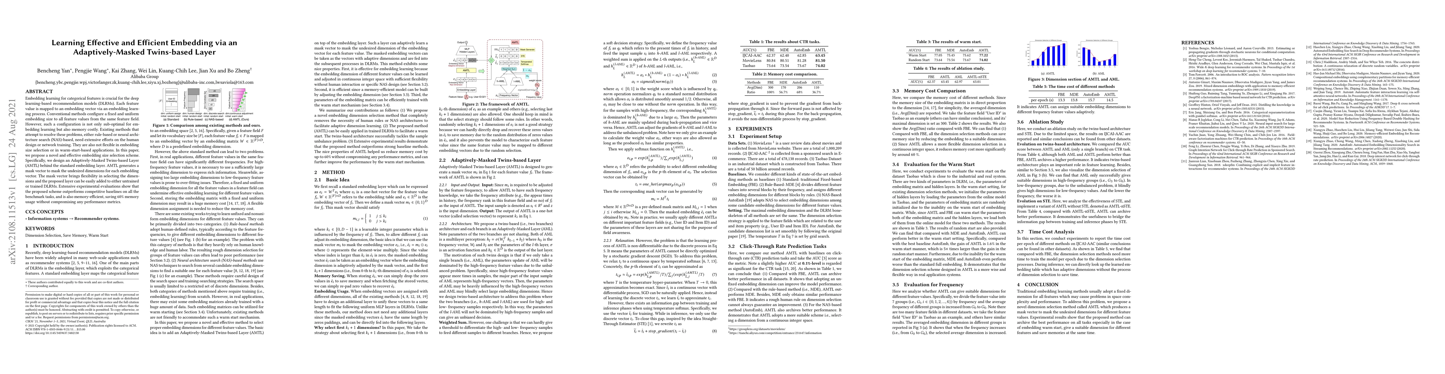 Embedding learning for categorical features is crucial for the deep learning-based recommendation models (DLRMs). Each feature value is mapped to an embedding vector via an embedding learning process. Conventional methods configure a fixed and uniform embedding size to all feature values from the same feature field. However, such a configuration is not only sub-optimal for embedding learning but also memory costly. Existing methods that attempt to resolve these problems, either rule-based or neural architecture search (NAS)-based, need extensive efforts on the human design or network training. They are also not flexible in embedding size selection or in warm-start-based applications. In this paper, we propose a novel and effective embedding size selection scheme. Specifically, we design an Adaptively-Masked Twins-based Layer (AMTL) behind the standard embedding layer. AMTL generates a mask vector to mask the undesired dimensions for each embedding vector. The mask vector brings flexibility in selecting the dimensions and the proposed layer can be easily added to either untrained or trained DLRMs. Extensive experimental evaluations show that the proposed scheme outperforms competitive baselines on all the benchmark tasks, and is also memory-efficient, saving 60\% memory usage without compromising any performance metrics.